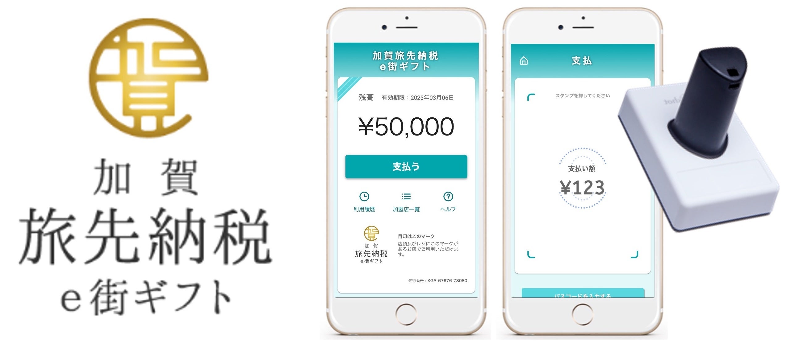 「加賀旅先納税e街ギフト」は、加賀市内の飲食・小売店等の加盟店(全20店舗※2022年10月12日(水)時点)で利用可能な電子クーポンで、市内での買い物や観光を楽しみながら地域経済に還元することができる、「旅先納税®」の返礼品です。寄附額に応じて、1,500円から90,000円まで全5券種の「加賀旅先納税e街ギフト」が返礼品として贈られます。受け取り・利用の際には、アプリなどのダウンロードは必要なく、加盟店での会計時に1円単位で利用いただけます。加盟店での処理も大変簡単で、利用したい金額を利用者がスマートフォンに入力、入力後に表示される「加賀旅先納税e街ギフト」の券面に、加盟店が電子スタンプ「giftee STAMP」(※3)を押印するのみで完了します。「giftee STAMP」の押印時に「消し込み」という処理が行われ、そのタイミングで利用済みのチケットとして認識されるため、再利用等の不正利用を防ぐことができます。