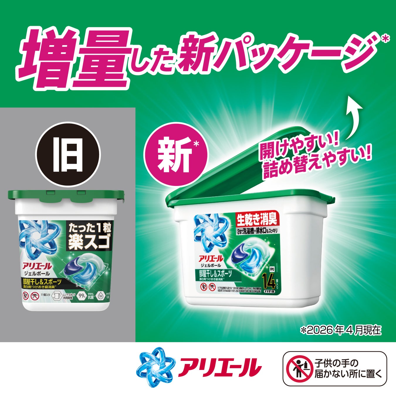 P&Gジャパン合同会社(本社:神戸市)は、衣料用洗剤ブランド『アリエール』の「アリエール ジェルボール プロ」シリーズをリニューアルいたします。新しくなった「アリエール ジェルボール プロ」シリーズは、2粒使いで、洗濯槽・フィルター・排水口まで洗濯機まるごと消臭*¹します。さらに、パッケージを約5年ぶりにアップデートし、より安全設計で開け閉めがしやすい仕様になりました。2026年4月中旬より全国で新発売いたします。
