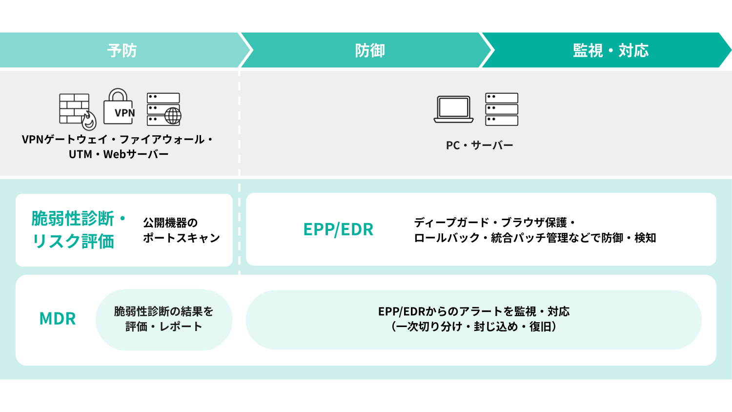 企業を狙うサイバー攻撃を業界最高評価の能力で防御・検知するEPP(エンドポイント保護プラットフォーム)とEDRをベースに、24時間365日運用をするMDR、侵入の起点となるVPN機器などの脆弱性診断までをセットで提供。常に最新の対策を更新しながら常時監視します。攻撃の成功率を極限まで引き下げ、セキュリティ人材が不足しているような企業でも、最小限の運用負荷で最高レベルの安全性を実現します。