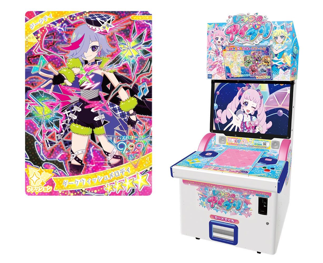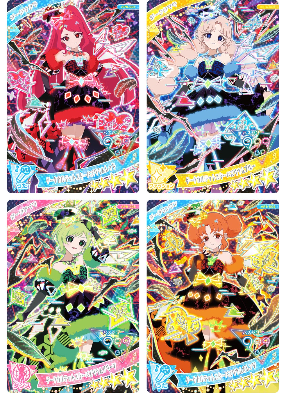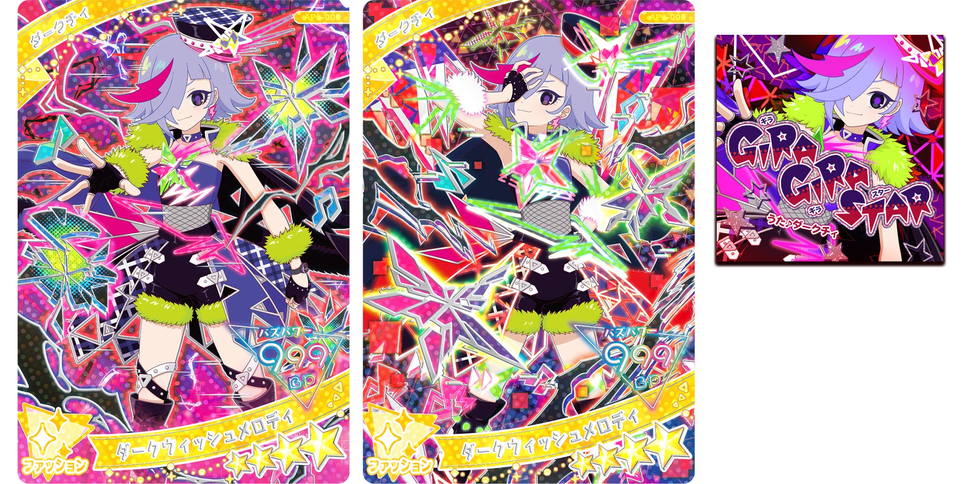 2025年2月6日(木)から稼動する「6だん」では、「ダークチィ」と「ダークカルテットスター」4人(「サクラ」「タマキ」「アイリ」「リンリン」)の「アイプリカード」が新たに登場し、ライブゲームを遊べるようになります。「ダークチィ」のカードではアニメにも登場した「ダークチィ」が歌う楽曲「GIRA GIRA STAR」、「ダークカルテットスター」のカードでは新曲「ニュースタージョーカー」でプレイすることができます。