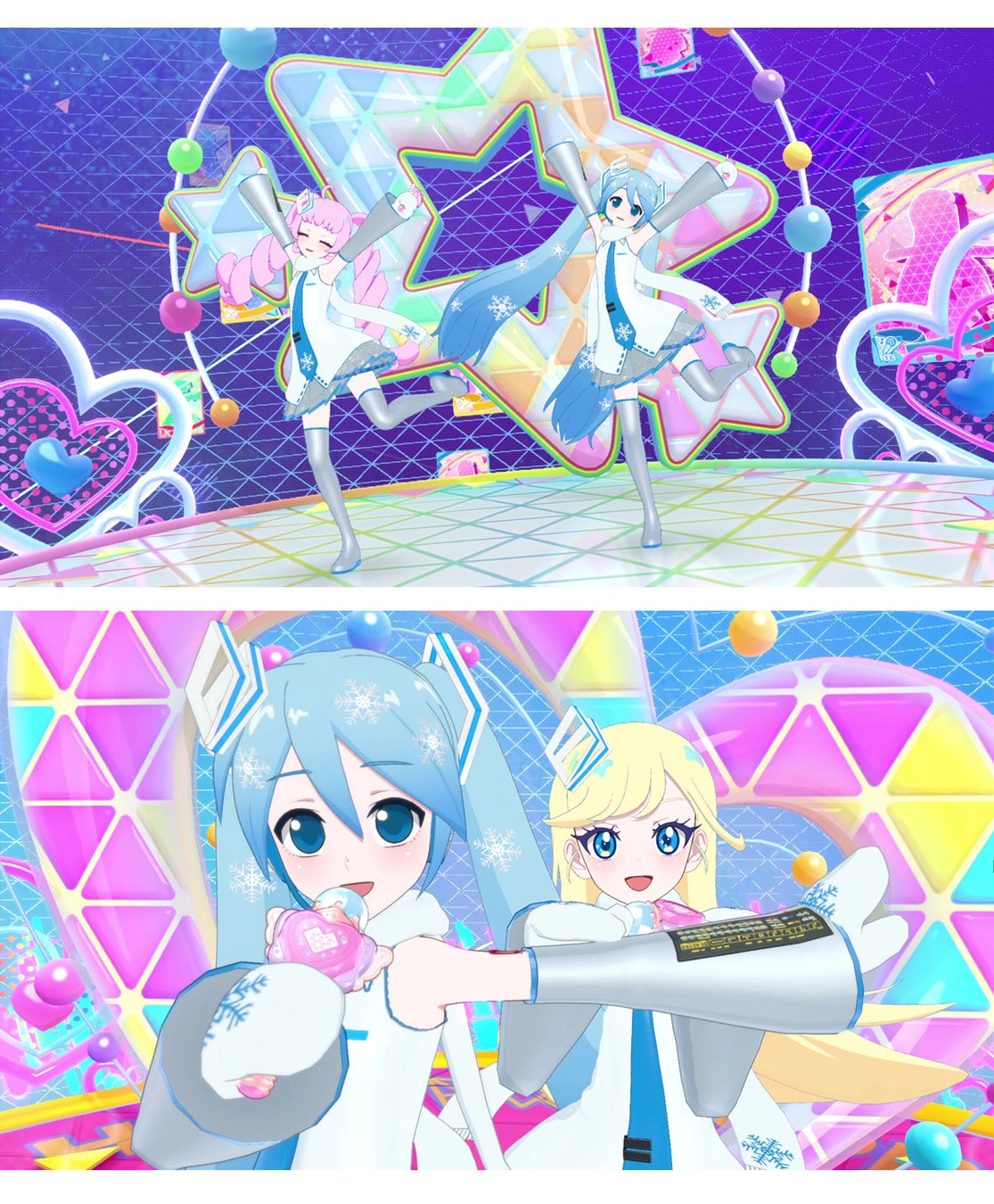 このコラボのために描き下ろした「雪ミク」と「ひまり」・「みつき」が並んだカードが登場し、ゲーム機に読み込むと「雪ミク」とお揃いのコーデを着た「ひまり」・「みつき」が画面にあらわれ、「雪ミク」と一緒にライブゲームを楽しむことができます。「雪ミク」が『ひみつのアイプリ』のゲームに登場するのは今回が初めてとなります。