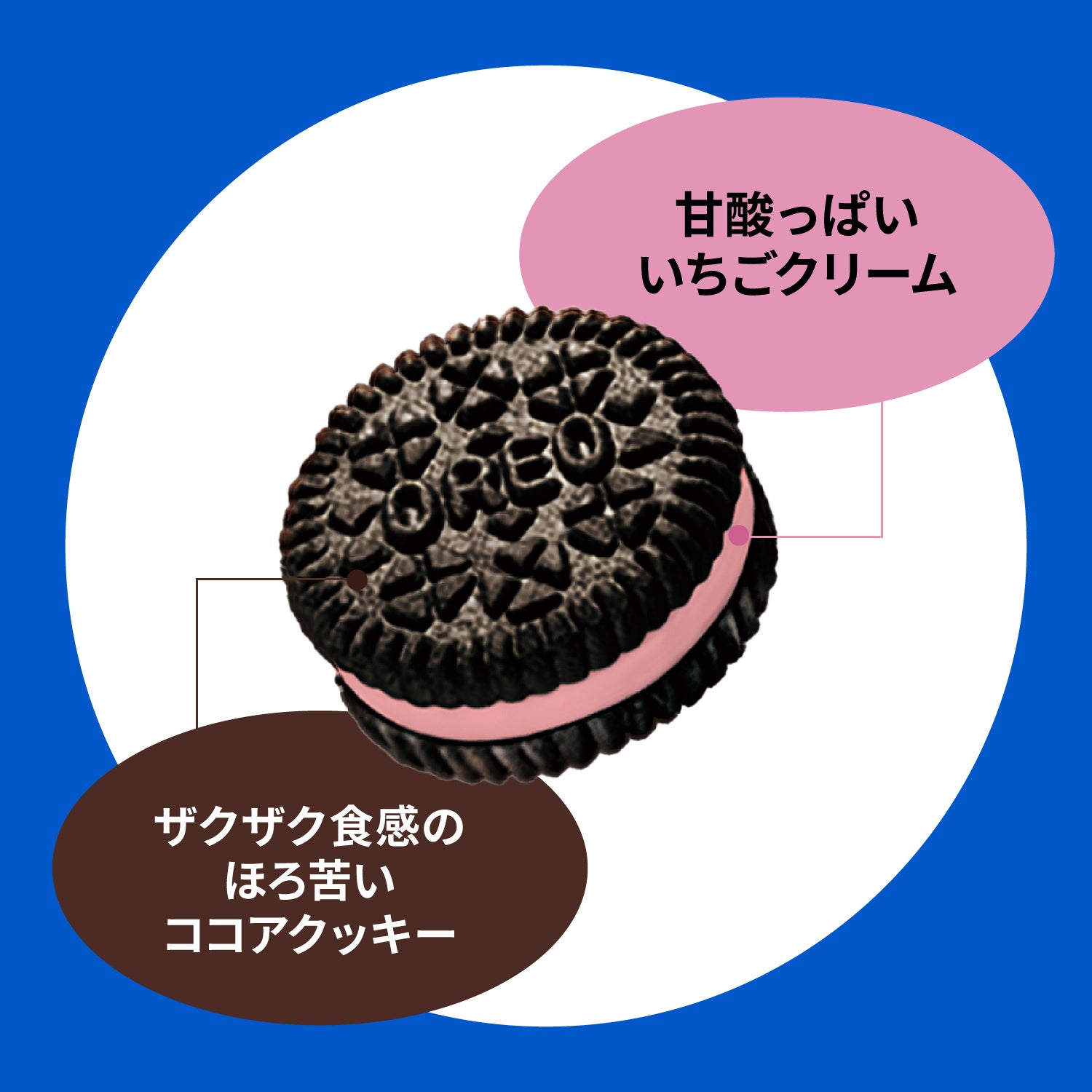 パッケージは、オレオのブランドカラー“青”に映えるピンクといちごのイラストが施されており、甘酸っぱい美味しさをポップに表現したデザインです。