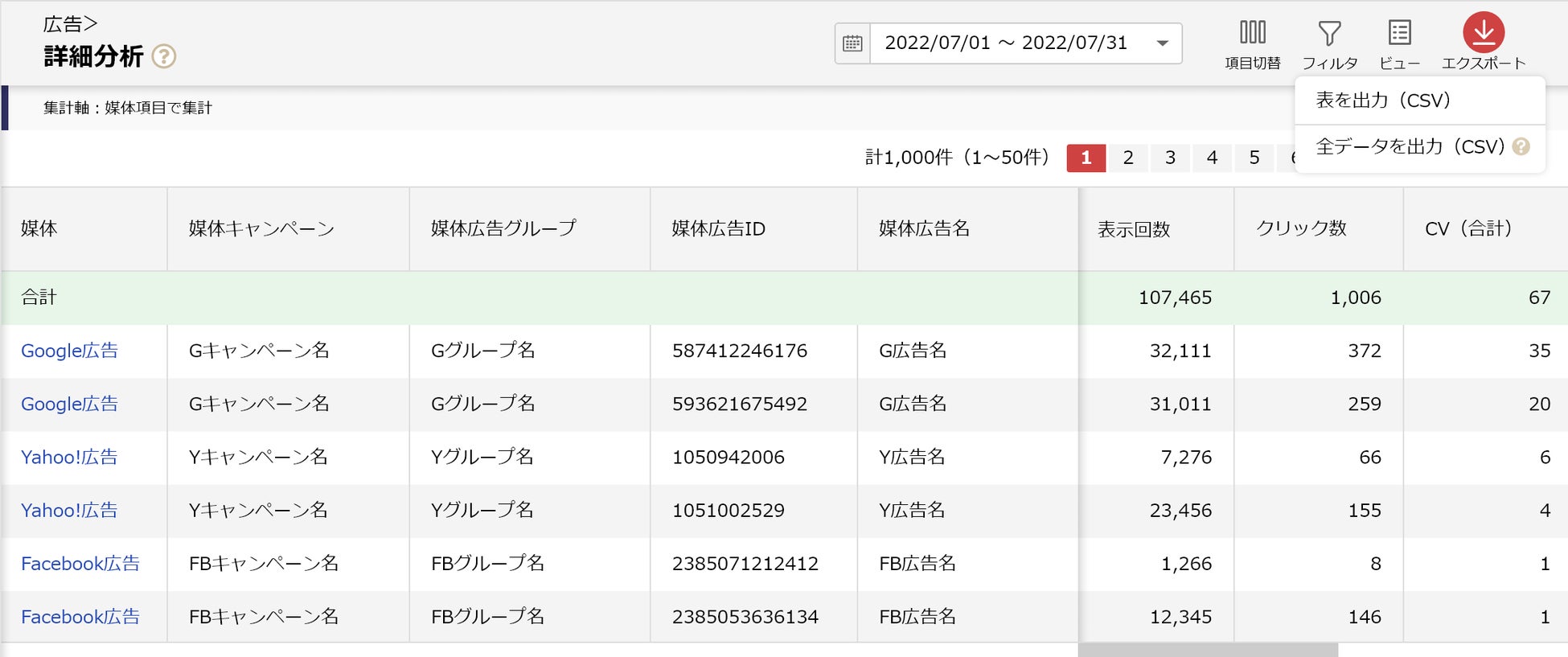 各広告媒体より自動取得可能な「広告コスト」「表示回数(インプレッション数)」「広告媒体名」「キャンペーン名」「グループ名」「広告名」といった各種広告データはアドエビス管理画面に日次で反映されるため、これまでデータの集計や加工にかかっていた時間を大幅に短縮するだけでなく、視覚化による迅速な現状把握を支援します。また、各データはCSVファイルにてレポート出力可能なため、施策全体の成果比較やレポーティングも簡単に実施できます。