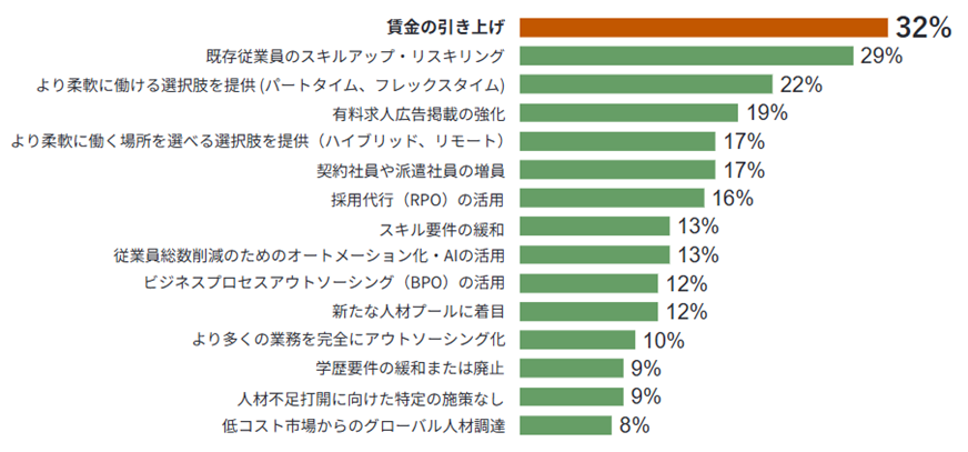 【2026年調査結果/日本】長引く人手不足を打開するために、雇用主が講じる施策:「賃金の引き上げ(32%)」などの施策が上位に