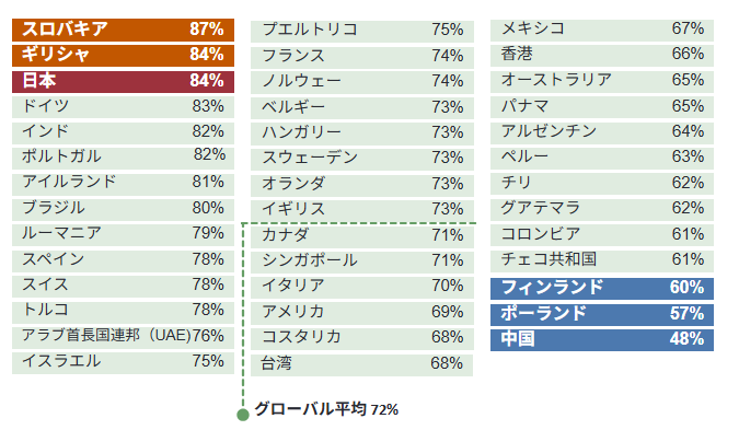41カ国・地域の中で人手不足感が最も高いのは、スロバキア(前年比+18ポイント、87%)、ギリシャ(前年比+4ポイント、84%)、日本(前年比+7ポイント、84%)の順でした。日本は世界平均(72%)を上回る84%と高い水準にあり、41カ国・地域では2番目に人手不足感が高い結果となりました。(図2参照)