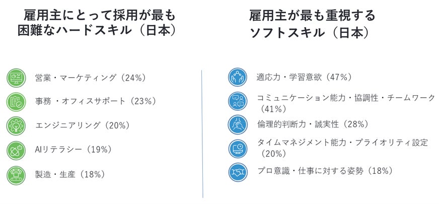 総合人材サービスのマンパワーグループ株式会社 (本社・東京都港区、代表取締役社長:池田 匡弥、以下マンパワーグループ)は、日本を含む世界41カ国・地域の雇用主を対象に、人材確保の困難さ、人材採用において需要の高いハードスキル※¹及びソフトスキル※²、人材不足解消に向けて雇用主が講じる施策について調査を実施、その結果を発表します。