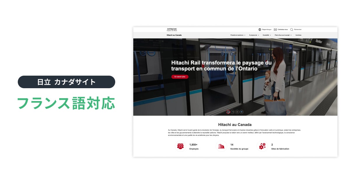 Wovn Technologies株式会社(以下 WOVN)が提供する Web サイト多言語化ソリューション『WOVN.io(ウォーブン・ドットアイオー)』が、株式会社 日立製作所(本社:東京都千代田区、執行役社長兼CEO 小島啓二、以下「日立」)のカナダ向けウェブサイトのフランス語(カナダ・フランス語)版に導入され、フランス語でのよりタイムリーな情報発信が可能となりました。WOVN.io は多言語対応の強化を通じ、さらなる日立のブランド価値向上に貢献していきます。