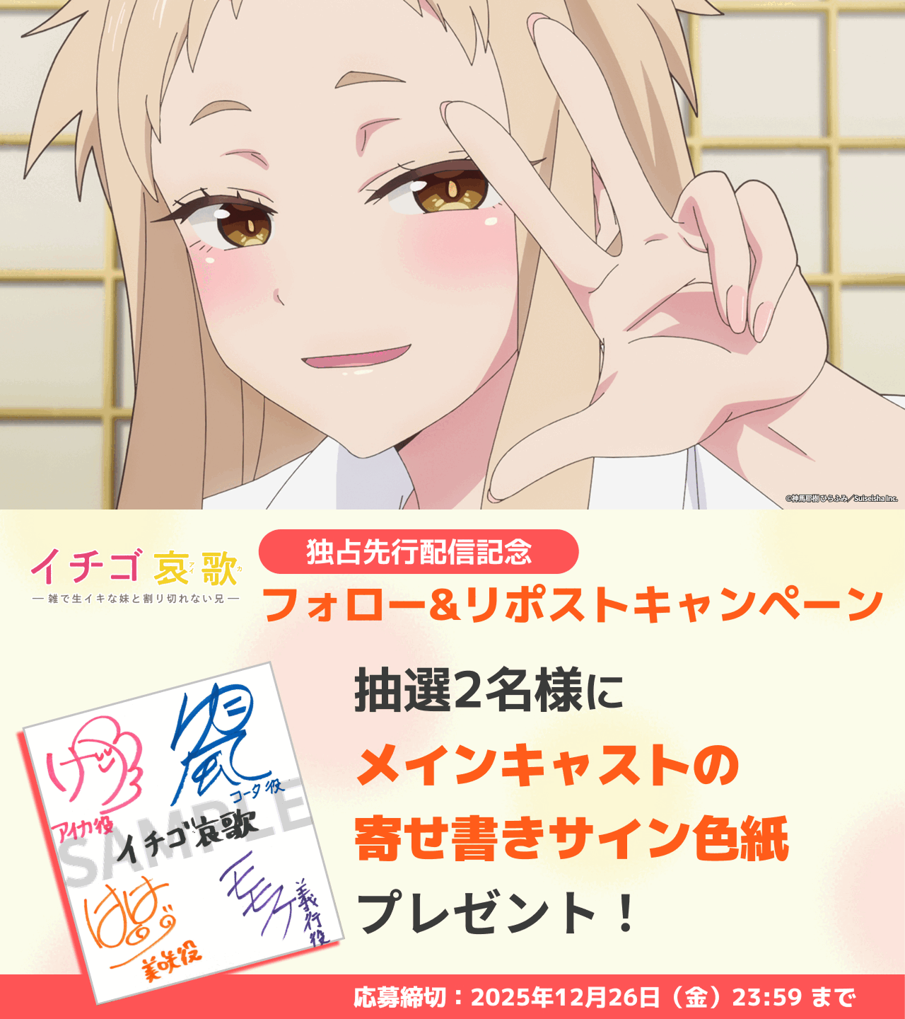 【本日より独占先行配信スタート!】新作アニメ『イチゴ哀歌』メインキャストの直筆サイン色紙が当たるプレゼントキャンペーン開催