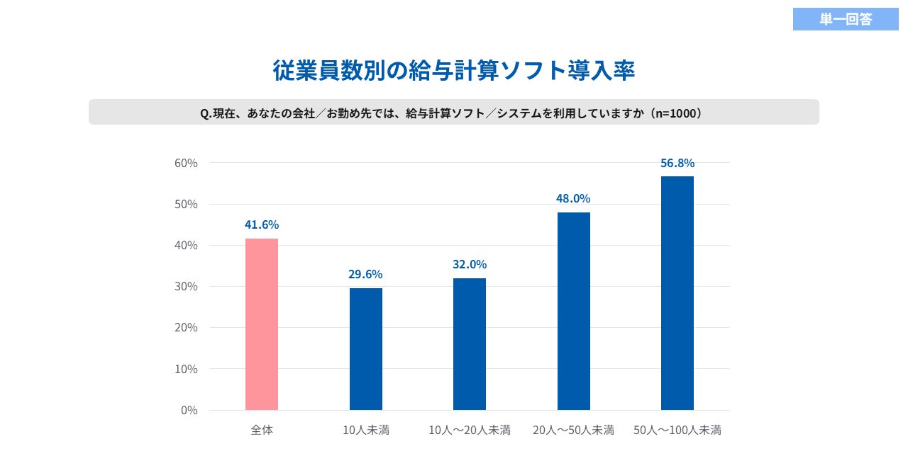 今回の調査結果では、給与計算ソフトの導入率が41.6%にとどまりました。特に10人未満の小規模企業では29.6%であることが分かりました。また、勤怠管理ソフトや労務管理ソフトはさらに導入が進んでおらず、導入率はそれぞれ28.1%、13.8%にとどまりました。いずれのソフトも 、導入率には従業員数との相関が見られ、従業員数が少ない企業ほど導入率が低いことが分かりました。