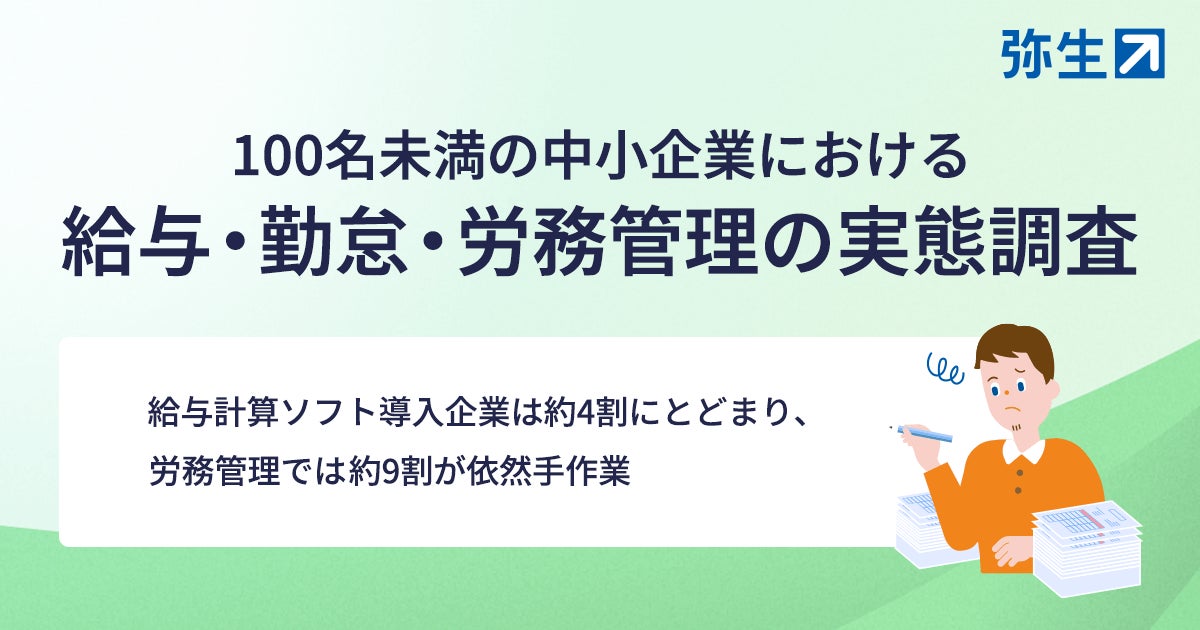 弥生株式会社(本社:東京都千代田区、代表取締役 社長執行役員 兼 CEO:武藤健一郎、以下「弥生」)は、中小企業における給与計算・勤怠管理・労務管理の実態を明らかにするため、全国の従業員100名未満の中小企業経営者・人事担当者を対象に調査を実施しました。その結果、給与計算ソフトの導入率は4割強にとどまり、労務管理に至っては約9割がいまだに手書きやExcelで対応している実態が明らかになりました。