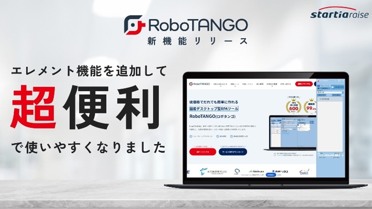 スターティアホールディングス株式会社(本社:東京都、代表取締役:本郷秀之、証券コード:3393)は、連結子会社でバックオフィスDX支援事業を手掛けるスターティアレイズ株式会社(本社:東京都、代表取締役:古川征且)が提供するRPAツール『RoboTANGO(ロボタンゴ)』において、Webやシステムの内部構造を解析し、操作対象を認識してRPAロボットを作成できる“エレメント機能”を本年9月26日(木)よりリリースしたことをお知らせします。