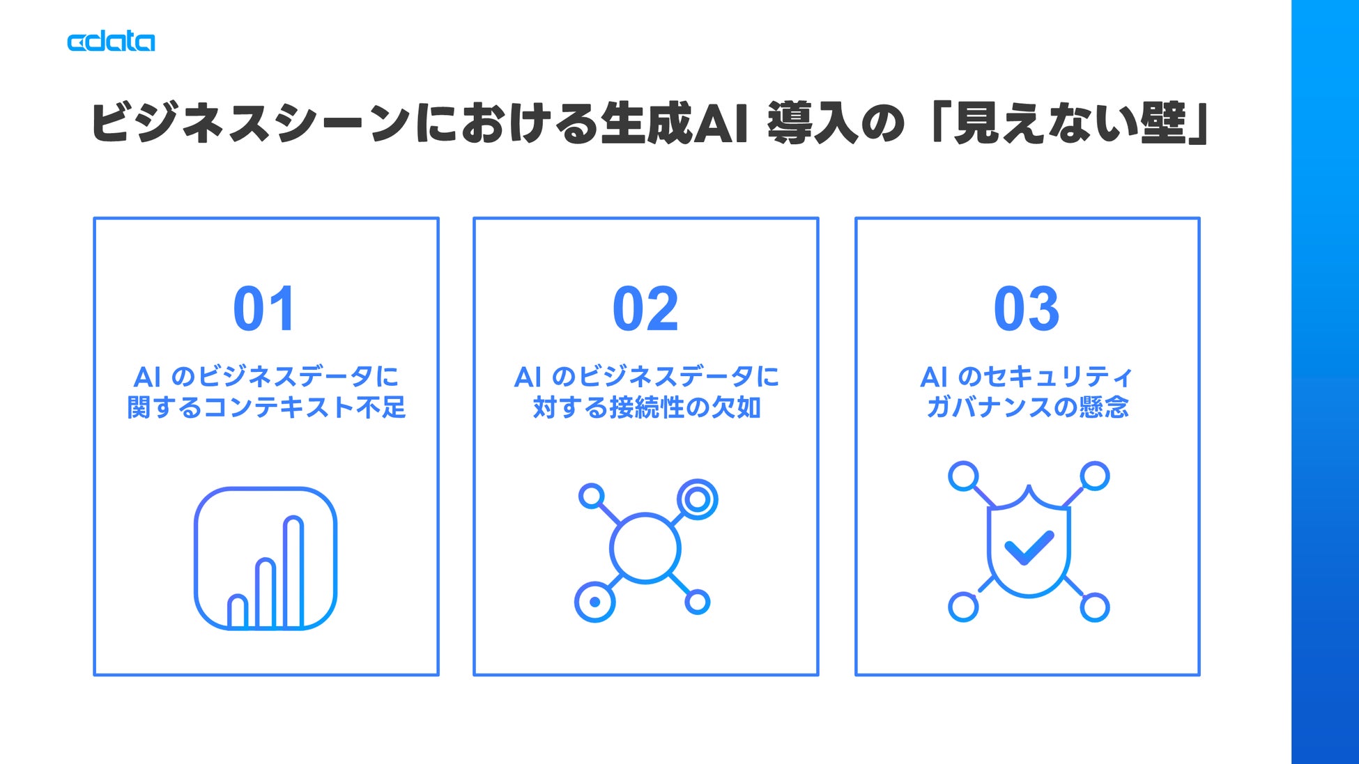 私達のビジネスデータはSalesforce、kintone、SAP などのCRM やERP といった各種業務システムに分散しており、ビジネスユーザーが普段利用するChatGPT やClaude などのAIが直接アクセスできません。プロンプトに直接Excel やCSV などをアップし対応することも可能ですが、インタラクティブ性を損ない業務への浸透の妨げになります。