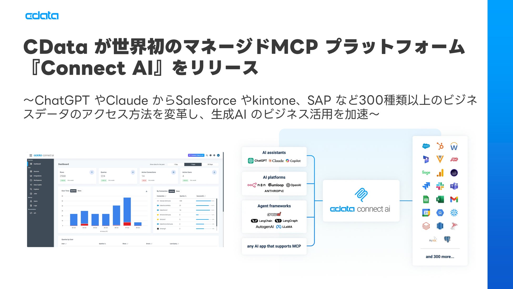2025年10月9日、リアルタイムデータ連携コネクタを提供するCData Software Japan 合同会社(本社:アメリカノースカロライナ州、日本オフィス:宮城県仙台市、代表社員 職務執行者:疋田 圭介、以下CData)は、世界初のマネージドMCP(Model Context Protocol)プラットフォーム『CData Connect AI(以下、Connect AI)』の提供開始を発表しました。Connect AI は、Claude やChatGPT などの生成AI アシスタントやAI エージェントからSalesforce、kintone、SAP、Google Sheets など300種類以上のビジネスデータへのセキュアかつリアルタイムなアクセスを実現します。