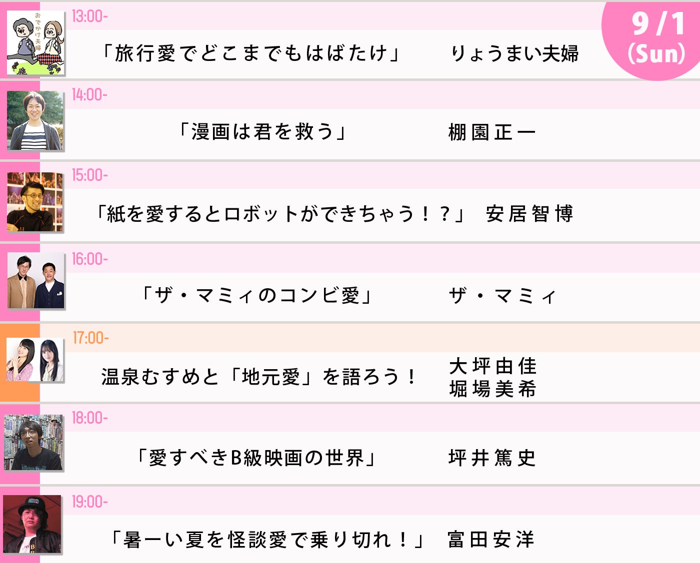飛永 翼(ラバーガール)/大水 洋介(ラバーガール)/林田 洋平(ザ・マミィ)/酒井 貴士(ザ・マミ ィ)/大蔦 エル/中村 剛/犯罪学教室のかなえ先生/稲田 俊輔/オムライス兄さん/本田 康祐(OWV)/木下 昌美/りょうまい夫婦/棚園 正一/安居 智博/大坪 由佳(温泉むすめ)/堀場美希(温泉むすめ)/坪井 篤 史/富田 安洋
