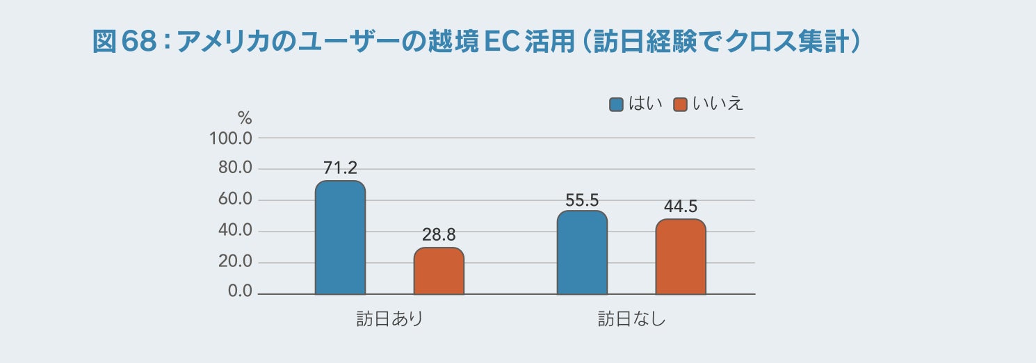 白書内、調査対象国のアメリカでは「訪日経験あり」と回答した人のうち、71.2%が「(日本のECサイトで商品の)購入経験あり」と回答し、訪日したことがない人に比べて15.7ポイント高い結果となりました。