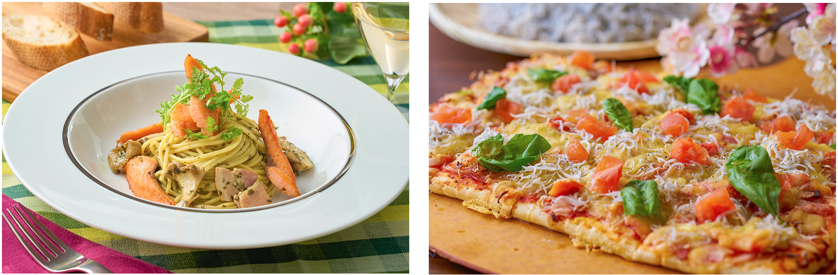 右:静岡県産のシラスと旬のきのこを使ったピザ。シラスとチーズの塩気とトマトソースの相性が抜群の一品。