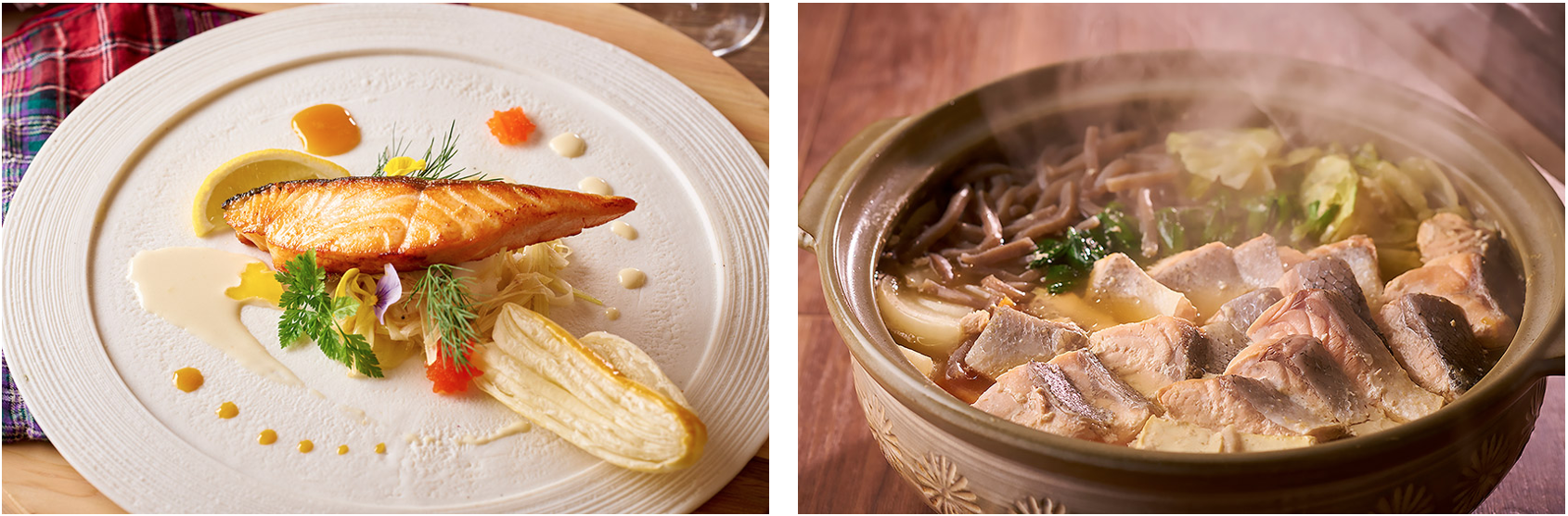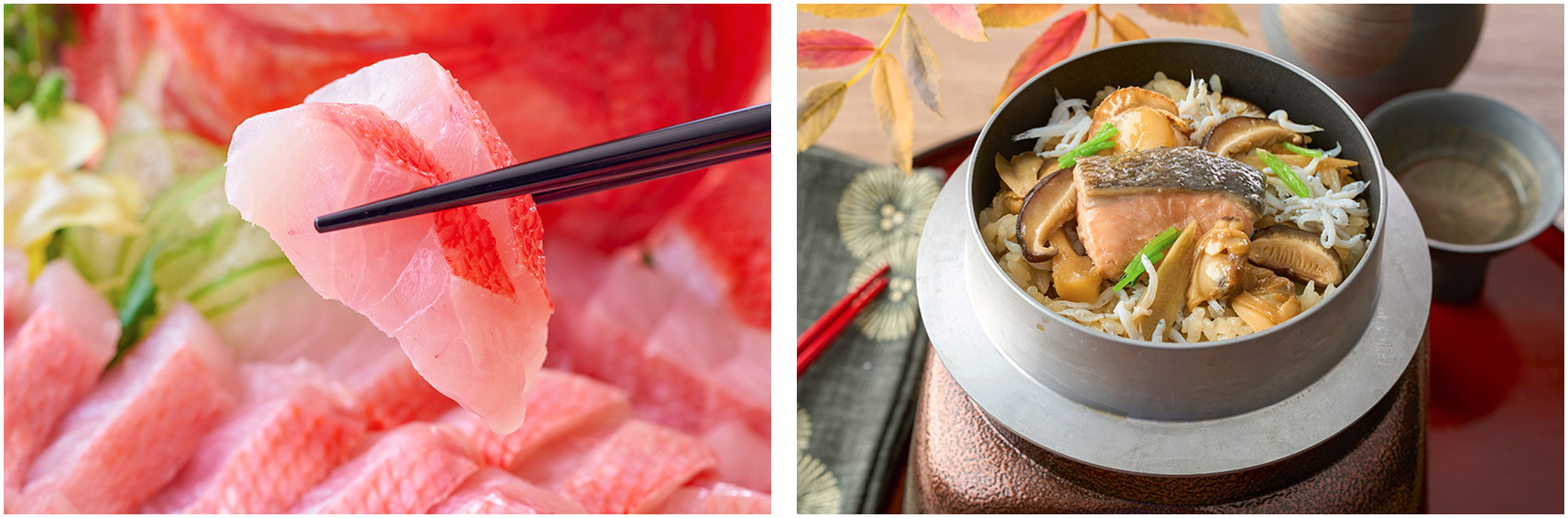 右:「富士山サーモンとどんこの釜めし」。テーブルで炊き上げ、炊き立てならではのふっくらとしたお米と釜底のおこげの香ばしさをお楽しみください。