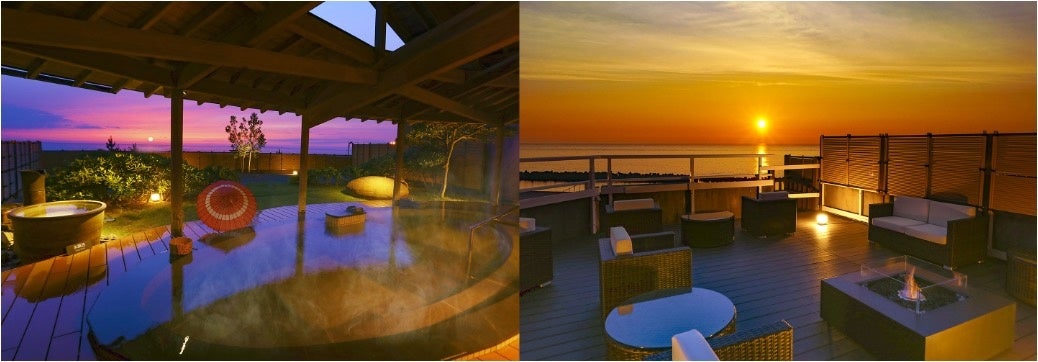 水平線に沈む秋の夕日を眺める宿。大江戸温泉物語【汐美荘】(新潟県 村上市)と【土肥マリンホテル】(静岡県 伊豆市)で9月1日、秋のまんぞくバイキングスタート!