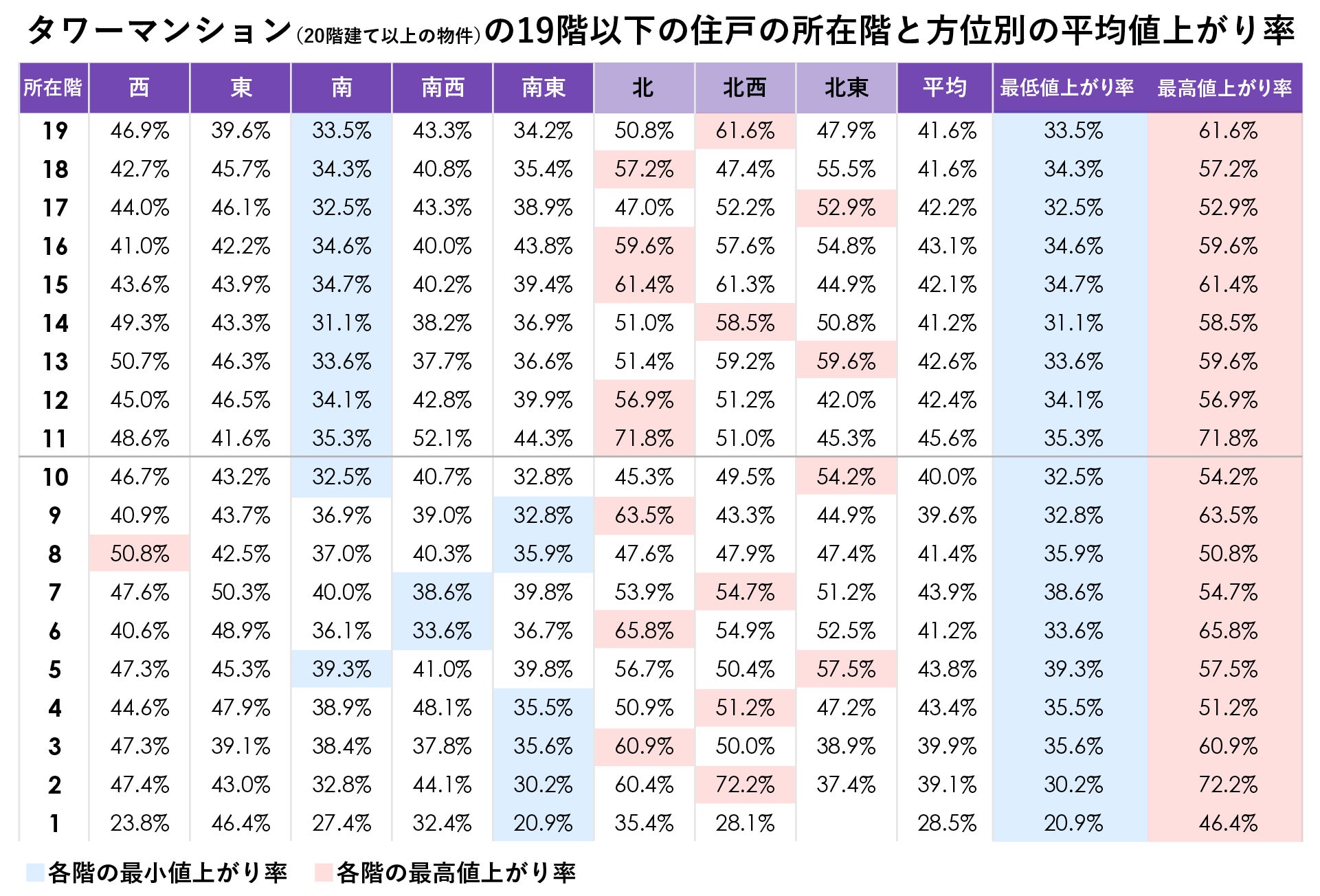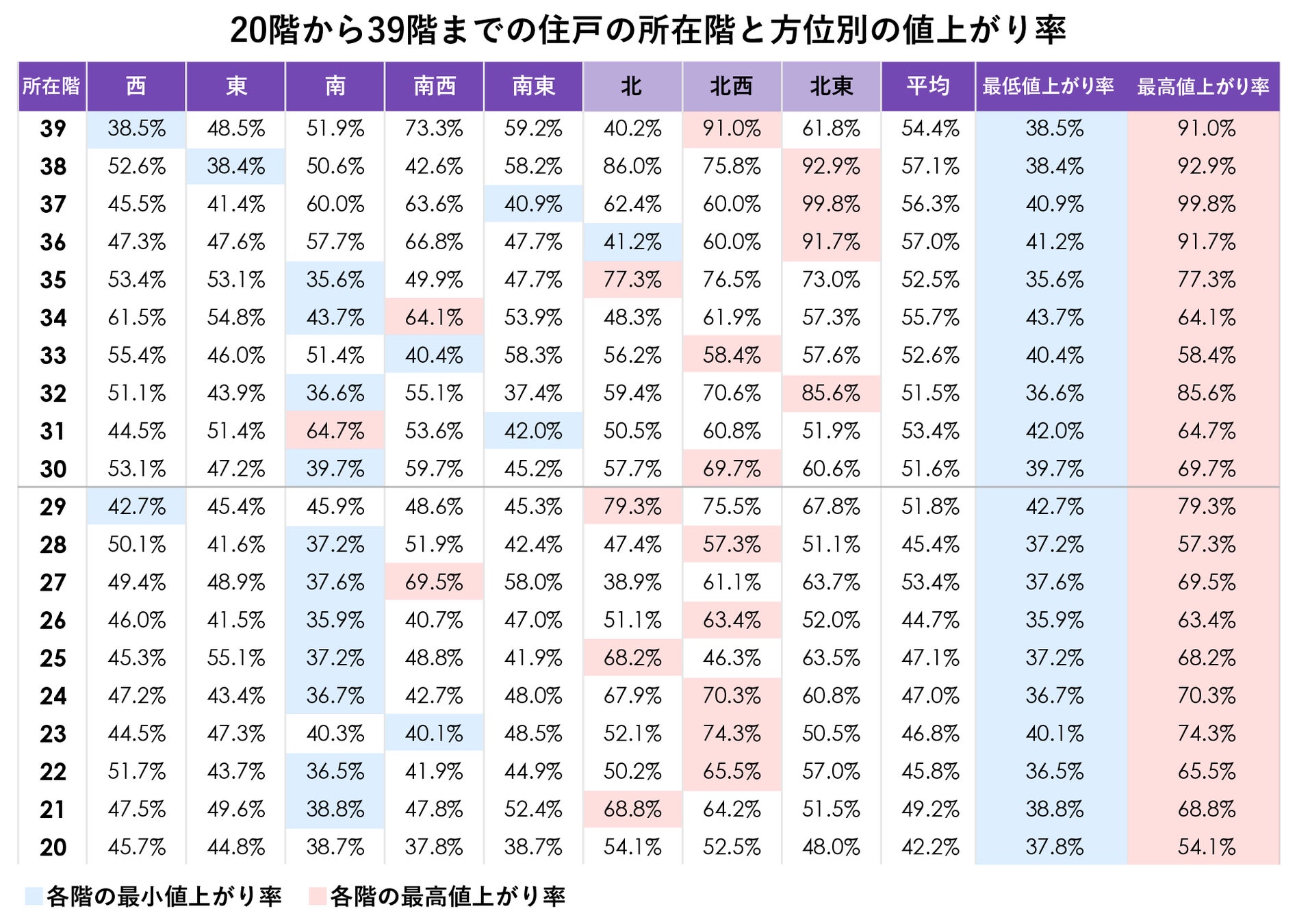 上記の表は住戸の20階から39階までの所在階と方位別の値上がり率を示した表です。所在階が20階以上になるため、すべてがタワーマンションの住戸ということになります。1階から19階ほどではないものの、北、北西、北東向きの優位は変わらず、真南をメインに南西、南東向きの部屋で青の網掛け(各所在階で最も値上がり率が低い)が目立ちます。