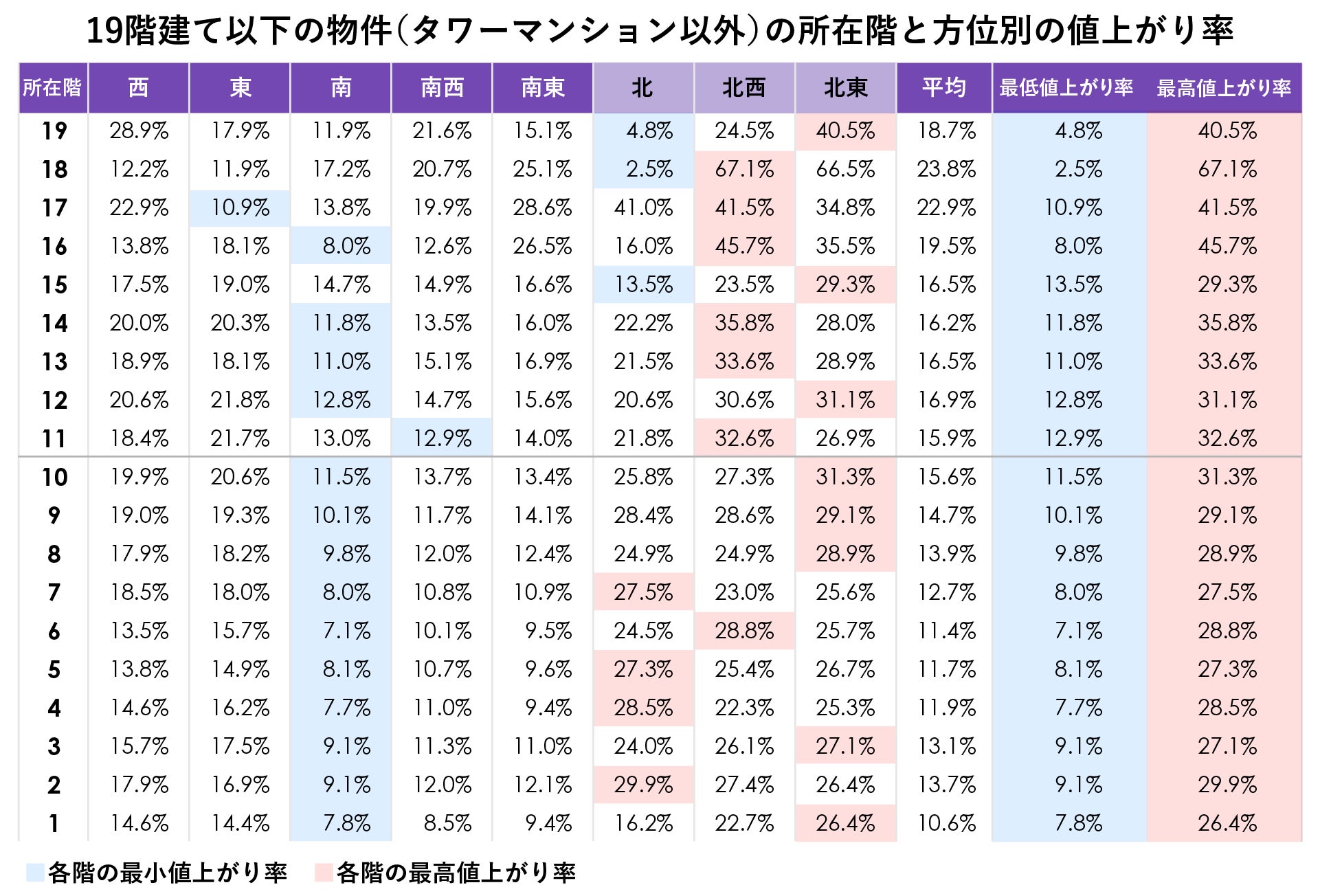 上の表は19階建て以下の物件(タワーマンション以外)の所在階と方位別の値上がり率を示した表です。同一の階で最も高い値上がり率だった方位がオレンジ色の網掛け、逆に最も低かった値上がり率の方位に青色の網掛けをしています。これを見ると、各階で最も値上がり率が高い方位は北向き、北東向き、北西向きが大多数を占め、最も値上がり率が低い方位はほぼ真南向きという結果になりました。