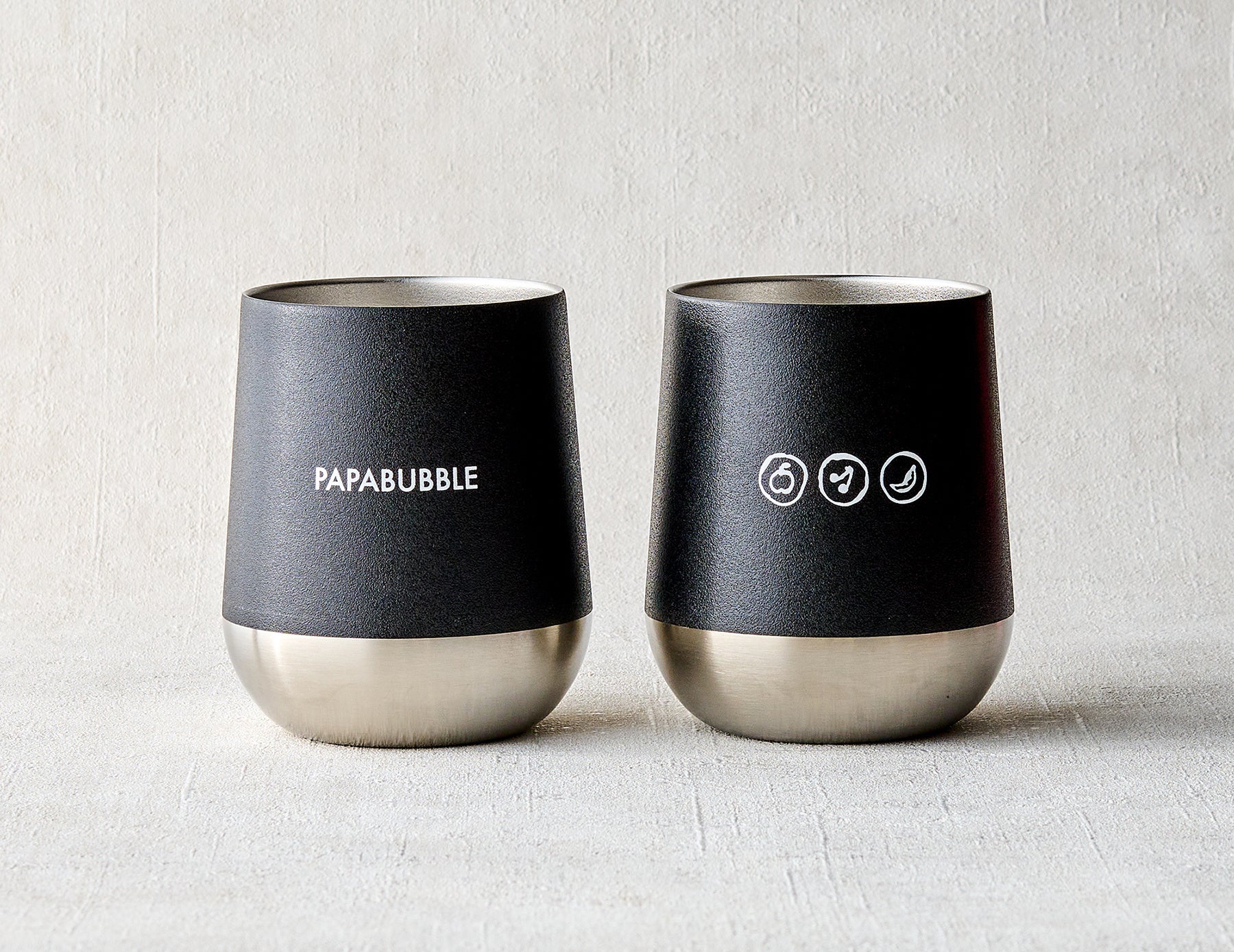 サーモマグは、その表面にはPAPABUBBLEロゴを、裏面にはりんご・チェリー・バナナのキャンディ柄をあしらったシンプルなデザインが特徴です。真空二重構造により、どんなに熱い飲み物を入れても外面が熱くならず、そのまま気軽に持つことができます。