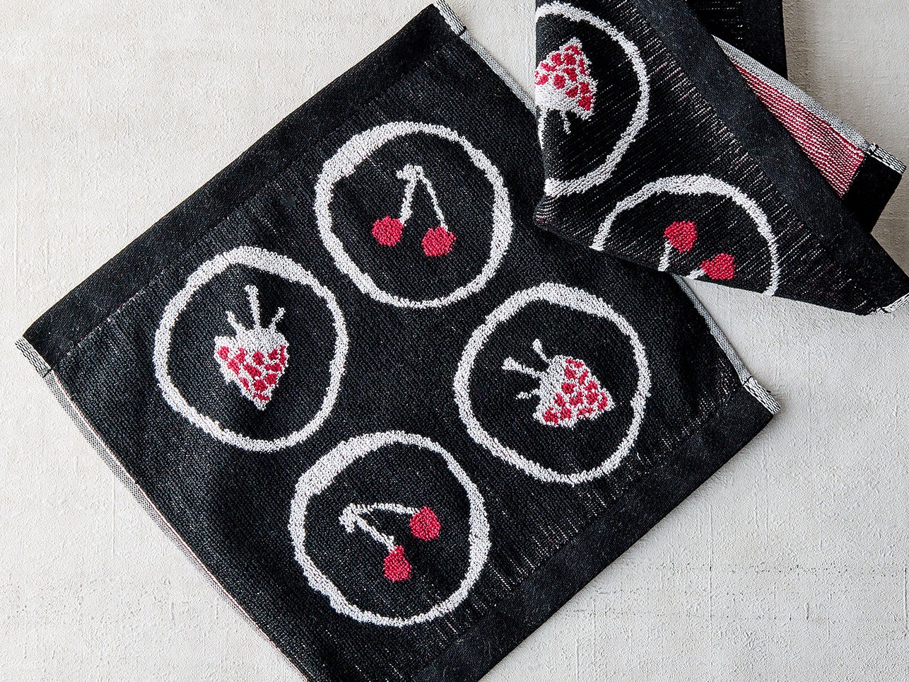 ハンドタオルは、イチゴとチェリーのキャンディ柄で仕上げられた、黒基調のデザインです。フルーツの実の部分はポイントカラーに赤色を使用し、可愛さをプラスしました。四国今治産の糸を使用した、綿100%のジャガード織りです。
