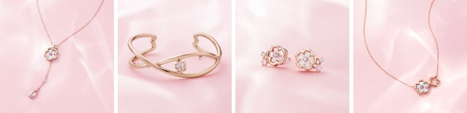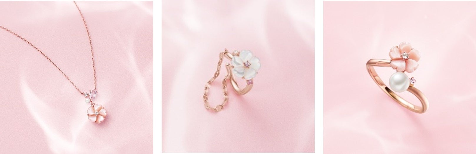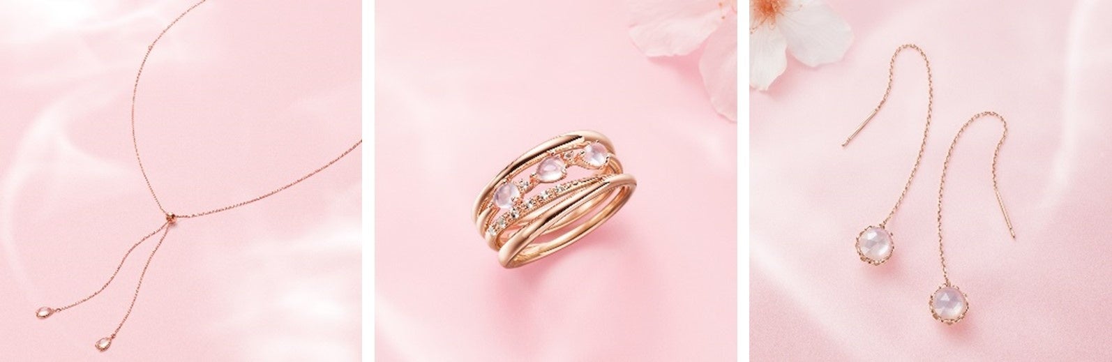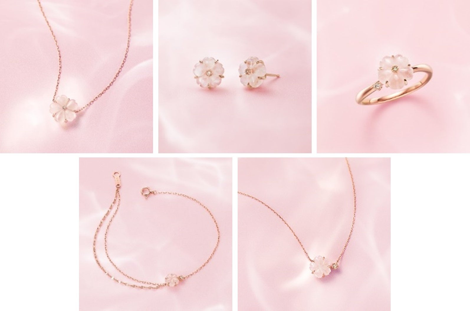 メインアイテムは、ぷっくりとしたオリジナルカットの桜が目を引くネックレスにピアス、リング。さらに、シェルで桜を象ったモチーフや、ローズクォーツの透明感を生かしたしなやかなネックレスなど、桜の可憐な表情や透明感に満ちた春色の輝きをジュエリーに落とし込みました。