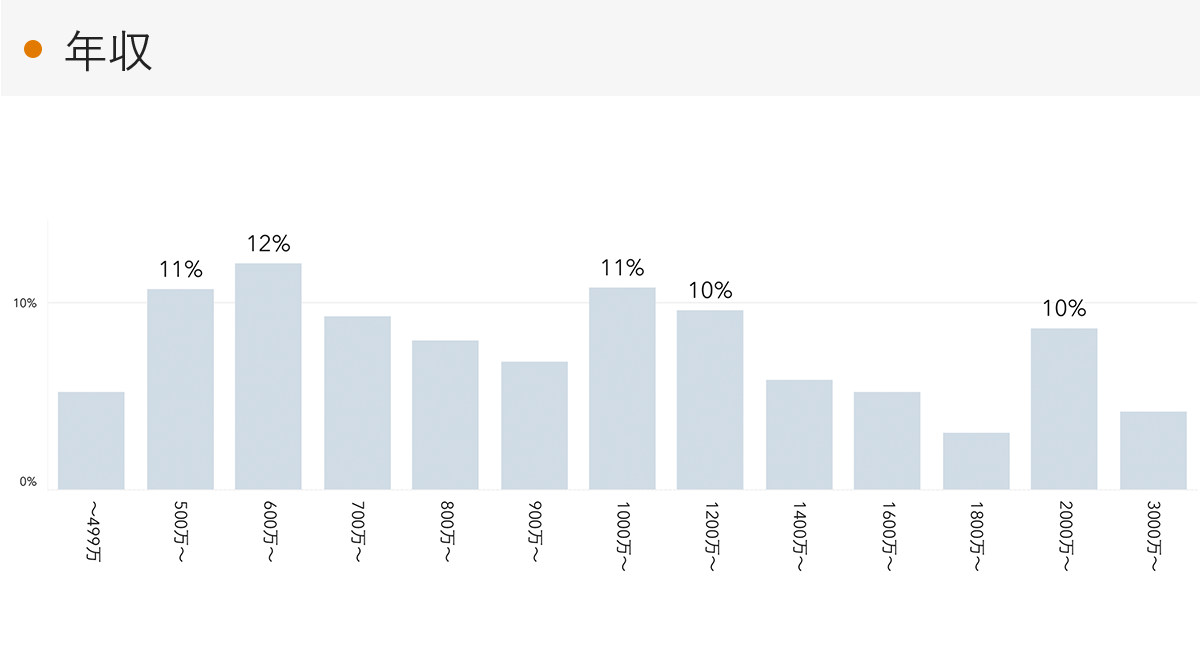 成約顧客の年収は、最も割合の多い年収は600万円台で12%、次に多い割合が500万円台・1,000万〜1,200万円未満で11%、1,200万〜1,400万円未満と2,000万円台で10%となりました。