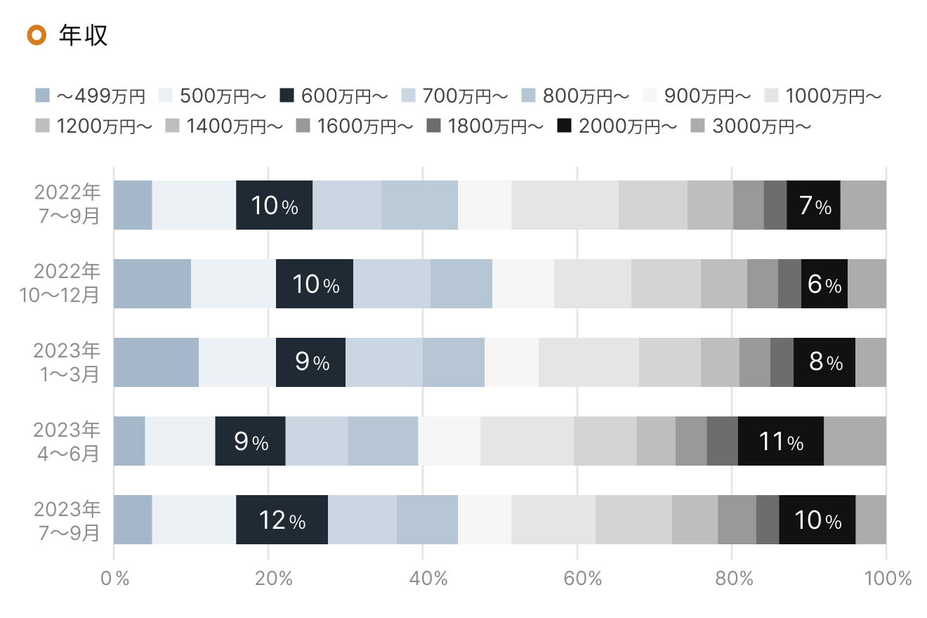 そこで、直近1年間における3ヶ⽉ごとの顧客動向を調査したところ、600万円台は前年同四半期(2022年7〜9⽉)と⽐較し+2ポイント、2,000万円台は前年同四半期(2022年7〜9⽉)と⽐較し+3ポイントとなり、2つの年収ゾーンで増加傾向が⾒られます。