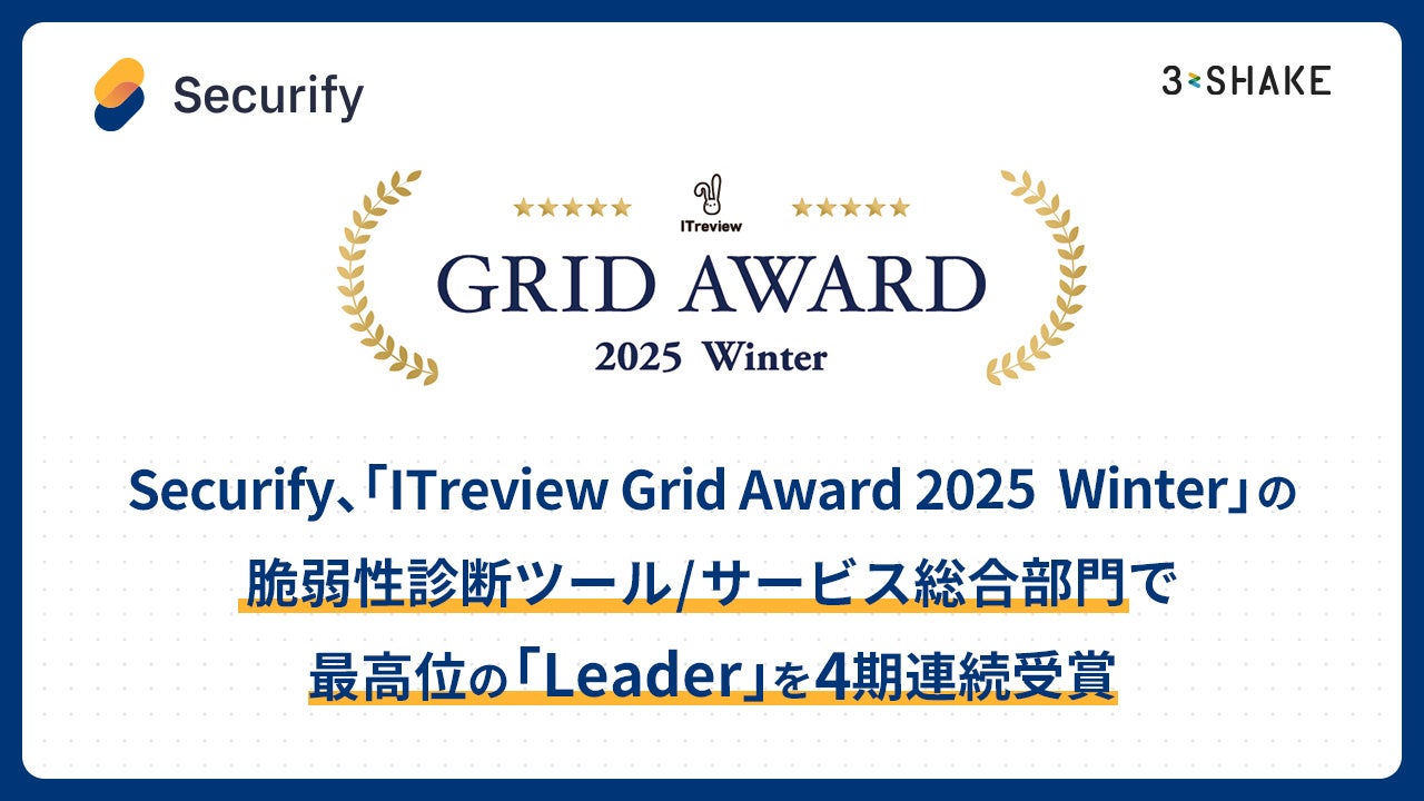 株式会社スリーシェイク(本社:東京都新宿区、代表取締役社長:吉田 拓真、以下スリーシェイク)が提供する、セキュリティツール「 Securify(セキュリファイ)」は、IT製品レビュープラットフォーム 「ITreview(アイティレビュー)」 において顧客満足度・製品認知度ともに優れた製品であると評価され、 「ITreview Grid Award 2025 Winter」 の脆弱性診断ツール/サービス総合部門、中堅企業部門の2部門において最高位の 「Leader」 を受賞したことをお知らせします。なお、今冬の受賞で、脆弱性診断ツール/サービス総合部門ではLeaderを4期連続、中堅企業部門ではLeaderを3期連続受賞となります。