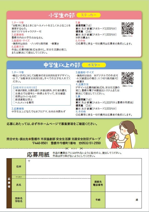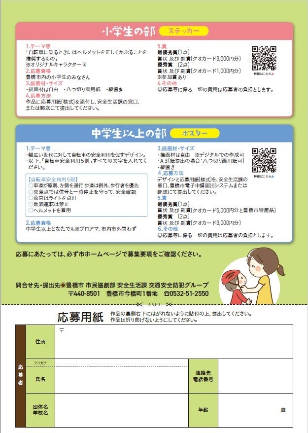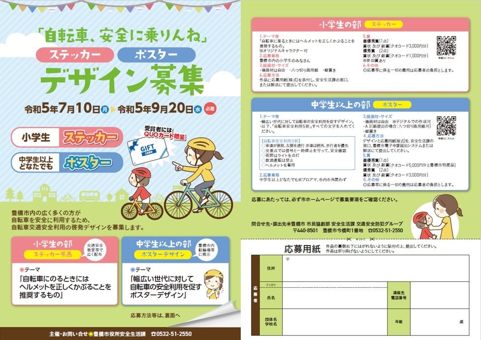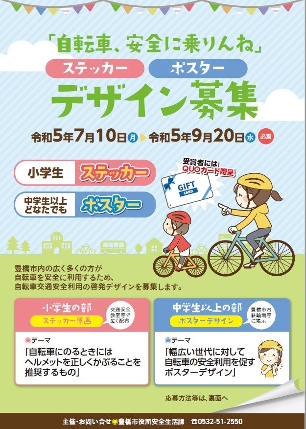 応募作品の中から最優秀賞1点、優秀賞2点を選びます。発表は11月を予定。最優秀賞は賞状とクオカード5000円分、豊橋市特産品、優秀賞は賞状とクオカード3000円分を贈ります。最優秀作品をポスターに採用し、市内駐輪場等に掲示します。