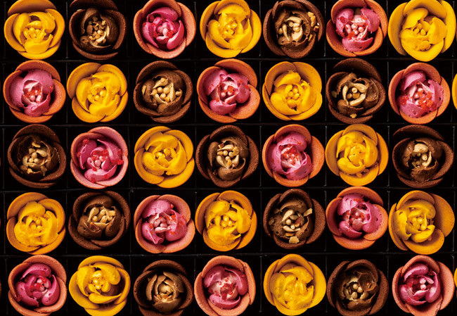 金井理仁シェフの代表作。可愛いチューリップと華やかなローズがひとつになった、とびきりよくばりなショコラスイーツです。繊細なラングドシャクッキー細工のチューリップの中に、とろけるホイップショコラのローズを咲かせました。甘酸っぱい「ベリー」、深みある「キャラメルナッツ」、爽やかな「パッションマンゴー」の3味のセット。