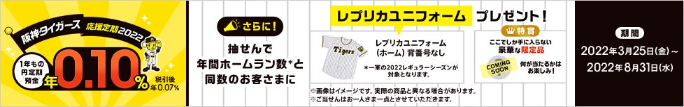 1年もの円定期預金を特別金利 年0.10%(税引後 年0.07%)で提供することに加え、適用条件を達成されたお客さまの中から抽せんで、阪神タイガースの2022シーズン年間ホームラン数と同数のお客さまに阪神タイガースレプリカユニフォームをプレゼントします。さらに超限定オリジナル商品(※)も抽せんでプレゼントします。