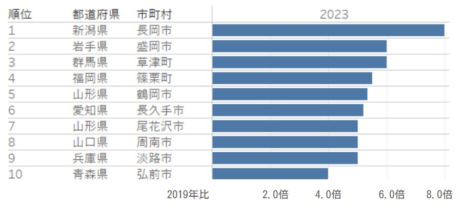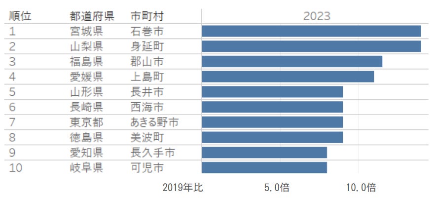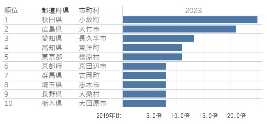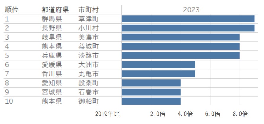 長野県坂城町は2019年対比78.0倍、秋田県小坂町は25.0倍、山梨県身延町は14.0倍、愛媛県大洲市はフランス人が7.5倍、イタリア人が5.0倍、福岡県篠栗町は5.5倍、熊本県益城町は8.0倍となっています。