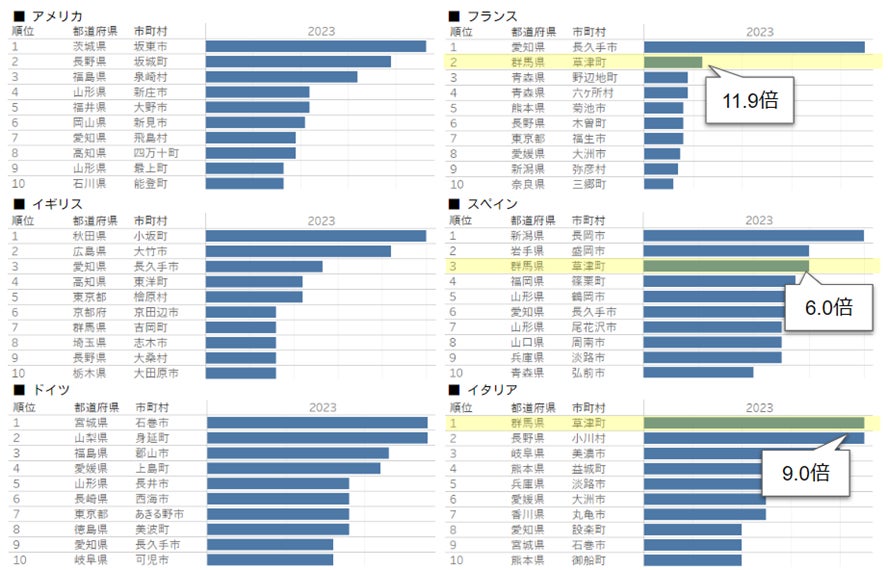 (図)欧米各国の人気急上昇トップ10を比較、フランス、スペイン、イタリアで草津町が上位に