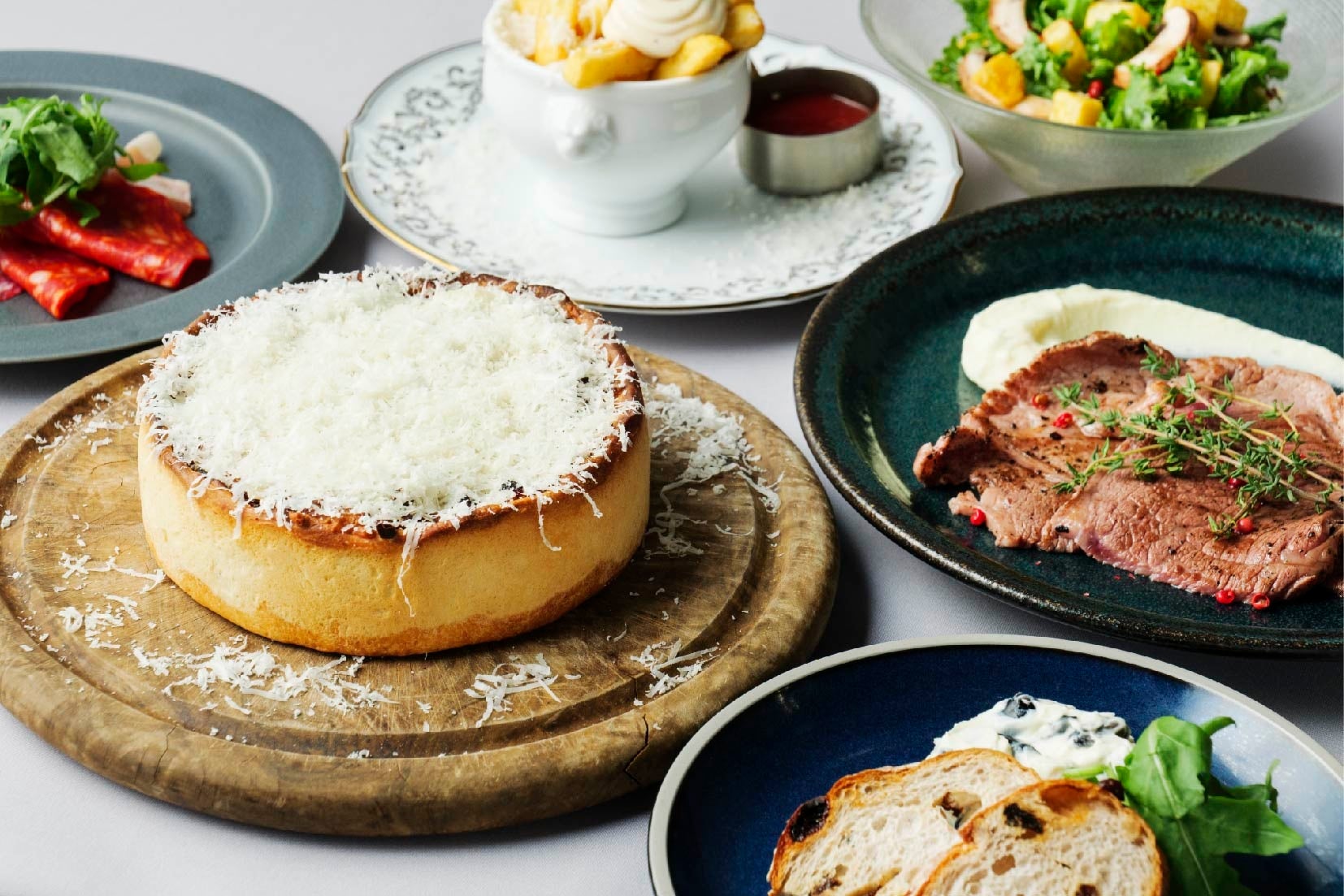 看板メニューのシカゴピザと人気の前菜2種、メインにはアメリカ産アンガス牛チャックアイステーキが楽しめる、乾杯ドリンク付きコース。