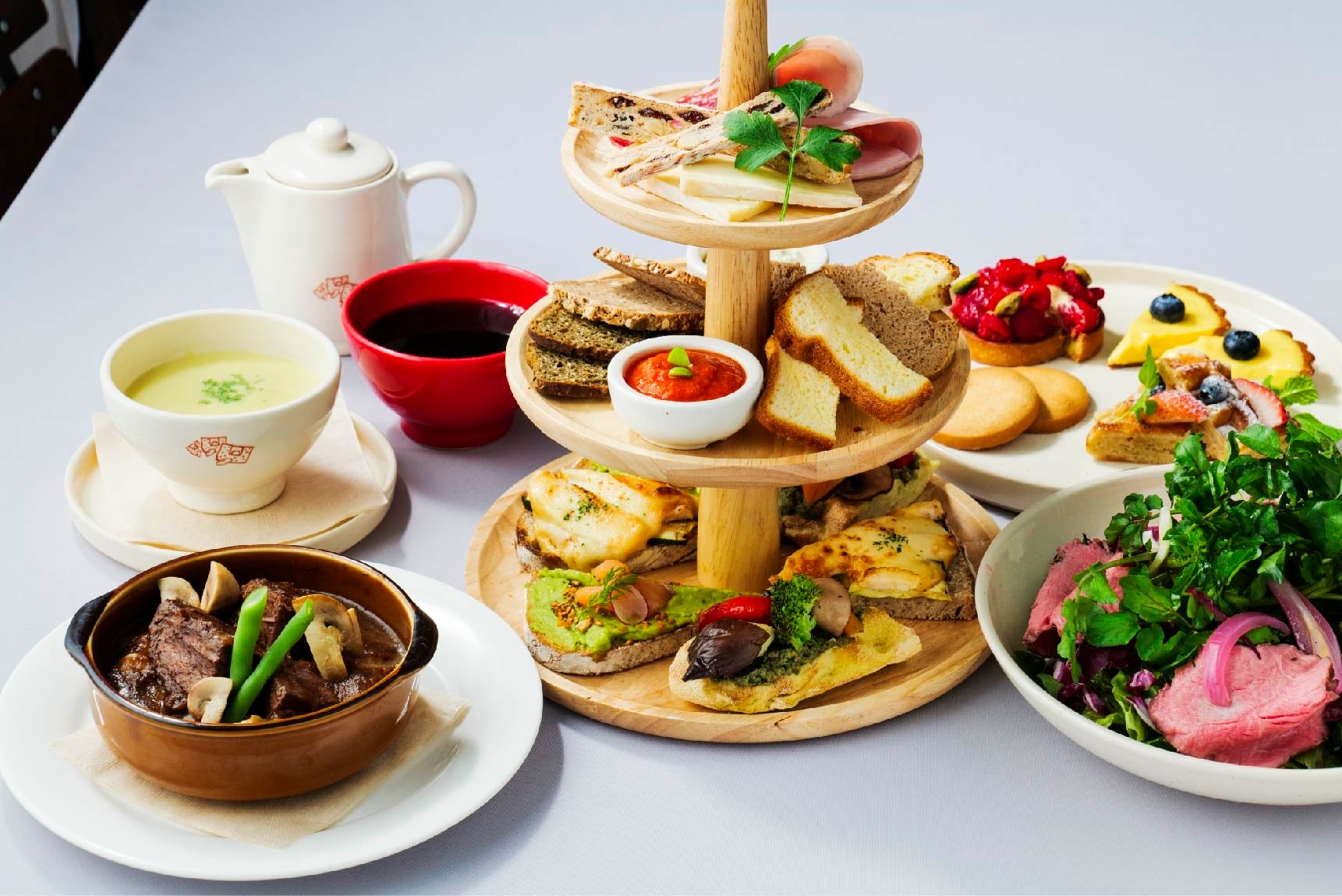ル・パン・コティディアンオリジナルのタルティーヌや前菜を盛り付けた木製タワーから始まり、牛スネ肉の煮込みをメインにした盛りだくさんの2時間飲み放題付きコースです。