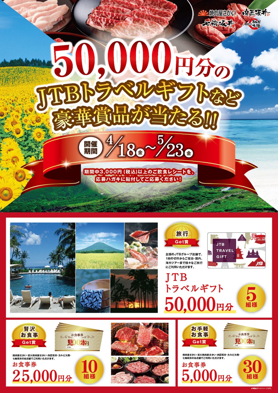 焼肉を食べて、ギフト商品を当てよう!焼肉屋さかい、炭火焼肉屋さかい、肉匠坂井、七輪坂井、カルビ大陸の106店舗では4月18日(金)~ 5月23日(金)までに各店舗にて3,000円(税込)以上ご飲食をいただいたお客様にJTBトラベルギフト50,000円分などが当たりますキャンペーンを行います。応募ハガキに3,000円以上のレシートを貼付して店内の応募箱もしくは郵便ポストにご投函ください。新シーズン到来のビッグな運だめしを美味しい焼肉と共にチャレンジしてください。皆さまのご来店をお待ちしております。