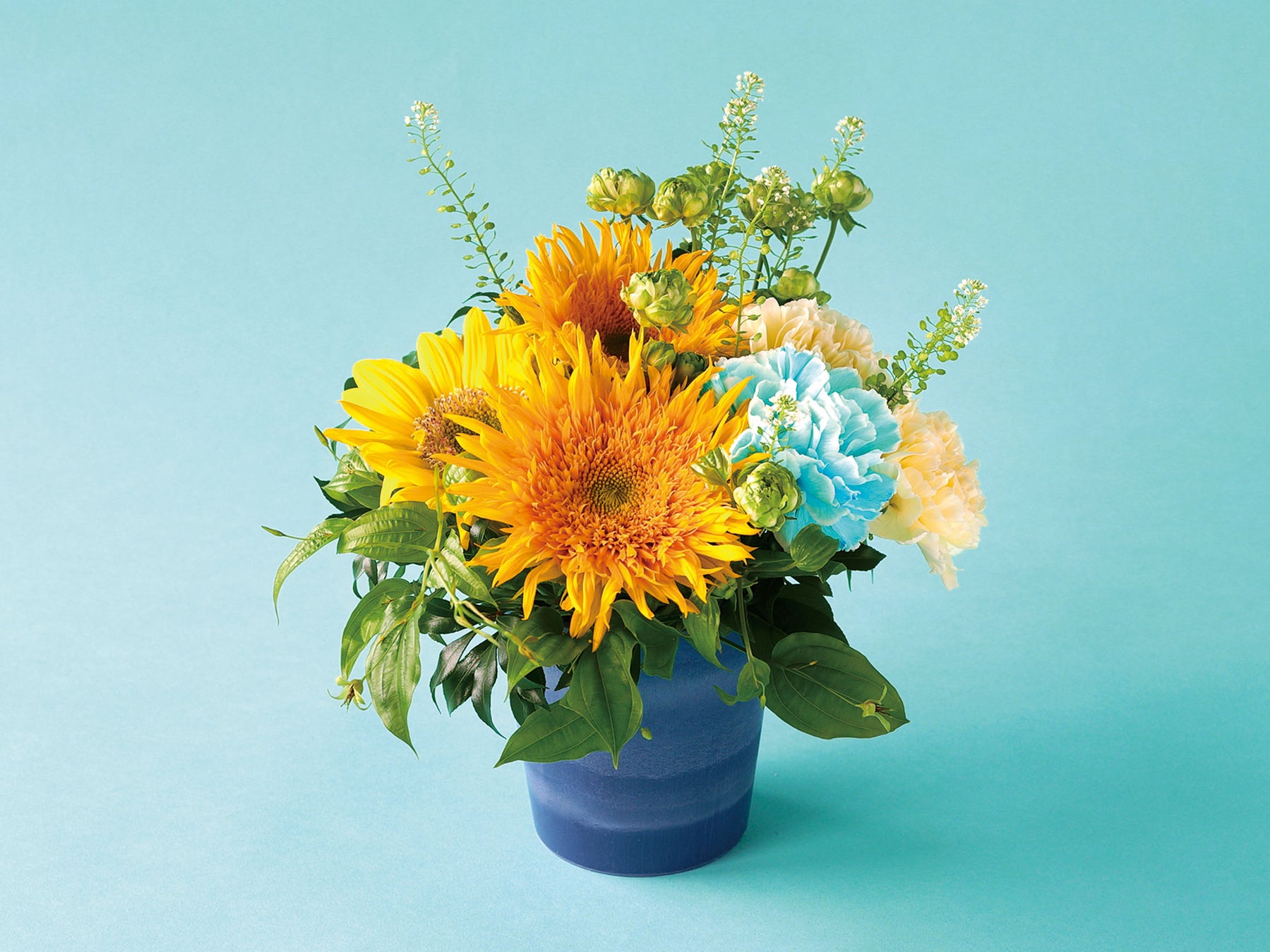 ヒマワリの鮮やかな黄色とブルーのアクセントが初夏にぴったり。器付きのため、花瓶に移し替える必要がなく、そのまま飾っていただけます。