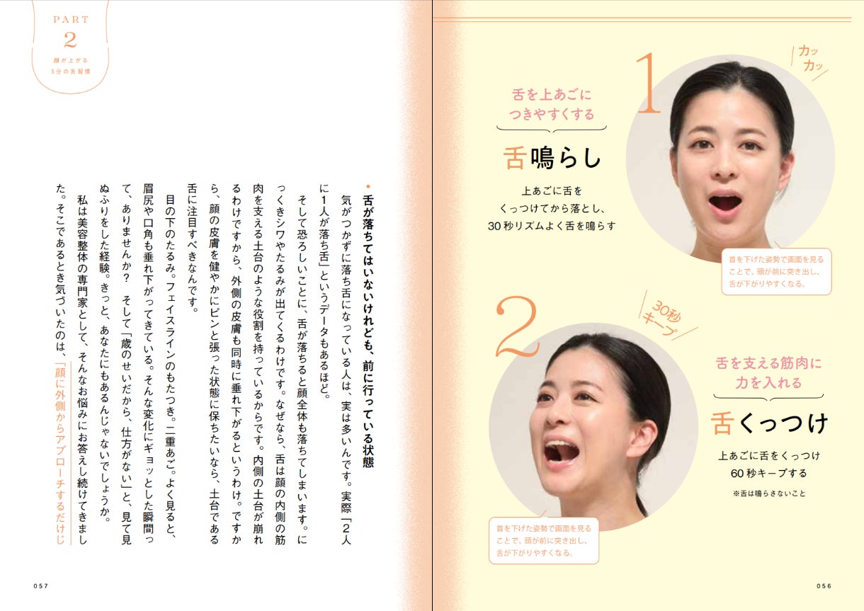 本書では、「顔に外側からアプローチするだけではダメ。リフトアップ施術や顔の筋トレでは長持ちしません。」と提唱。ほうれい線、目元のシワ、口元のたるみ、二重あごの原因となる「落ち舌」を改善することで、内側から美しさを引き出す方法を解説します。