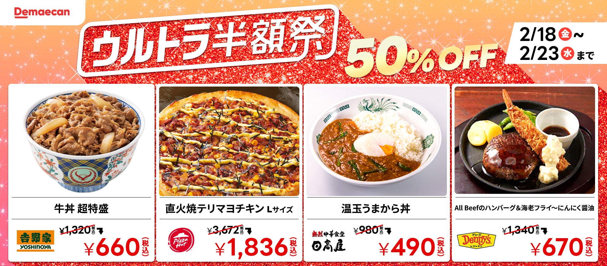 『出前館』、今回で20回目となる「ウルトラ半額祭」2月18日(金)から過去最長6日間開催!
