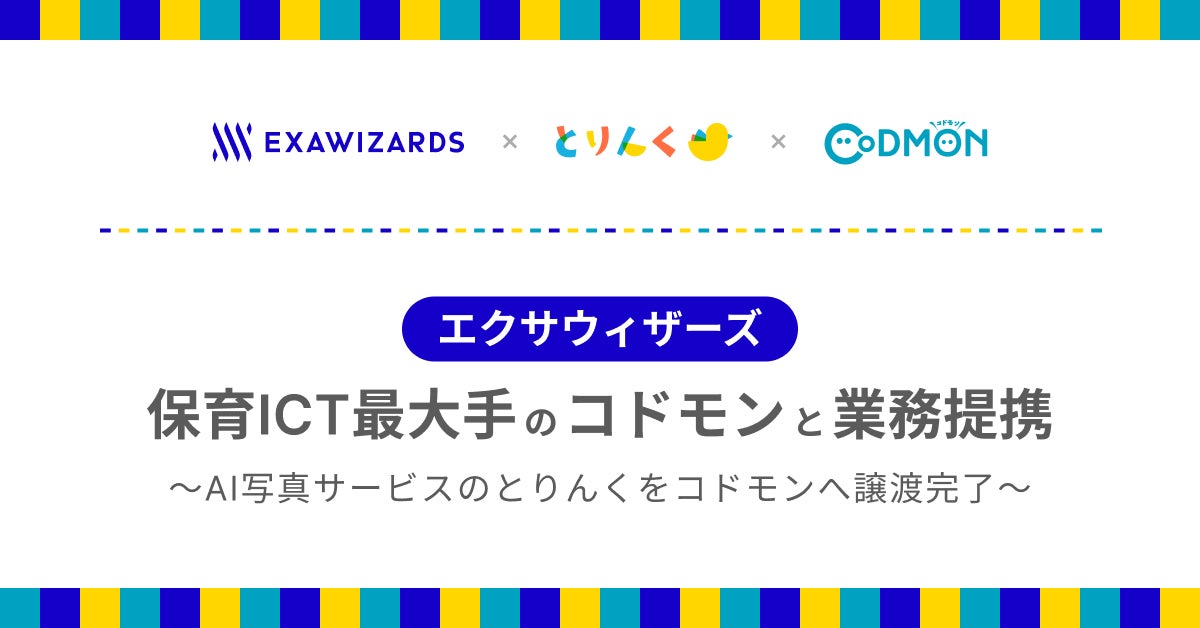 株式会社エクサウィザーズ(東京都港区、代表取締役:春田 真、以下エクサウィザーズ)は、子会社である株式会社とりんく(旧社名:VisionWiz、本社:東京都港区、代表取締役:山中健太郎、以下とりんく)の全株式の株式会社コドモン(本社:東京都港区、代表取締役:小池義則、以下コドモン)への譲渡が完了し、同時に、業務提携に向けた基本合意書を締結したことをお知らせします。