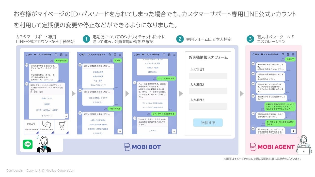 これら全てが実現できること、またコスト面での評価から、ファンケルは当社のCX戦略支援サービスを採用し、チャットボットをはじめとしたモビルスの各サービスを導入するに至りました。