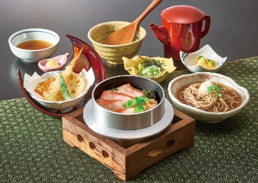 鮮度抜群の大型金目鯛を塩麴でひと晩熟成し、皮目を香ばしく炙ることで、金目鯛の美味しさを引き出しています。釜めしスタイルのアツアツのごはん・天ぷら・麺がセットのボリューム抜群の商品です。