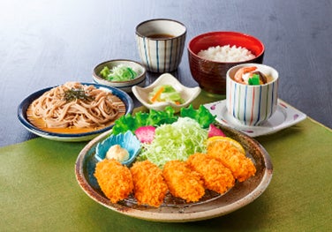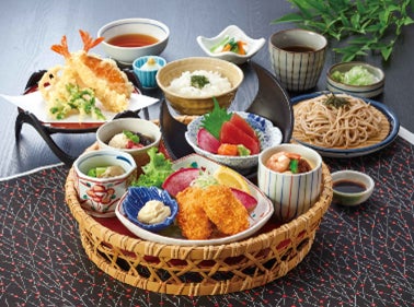 サガミ自慢のおろしそば、天ぷらに、広島県産大粒かきフライ、刺身がついた彩豊かな御膳。食べ応えも抜群です。