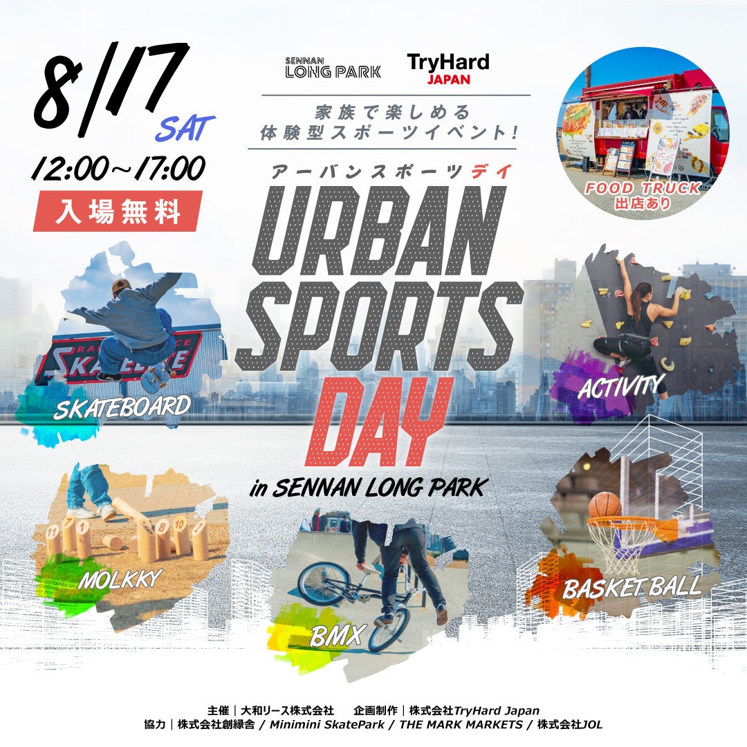 2024年6月23日(日)、SENNAN LONG PARK(センナンロングパーク)(所在地:大阪府泉南市)にて、開催を予定しておりました、スポーツイベント「URBAN SPORTS DAY in SENNAN LONG PARK」を2024年8月17日(土)に延期することをお知らせいたします。