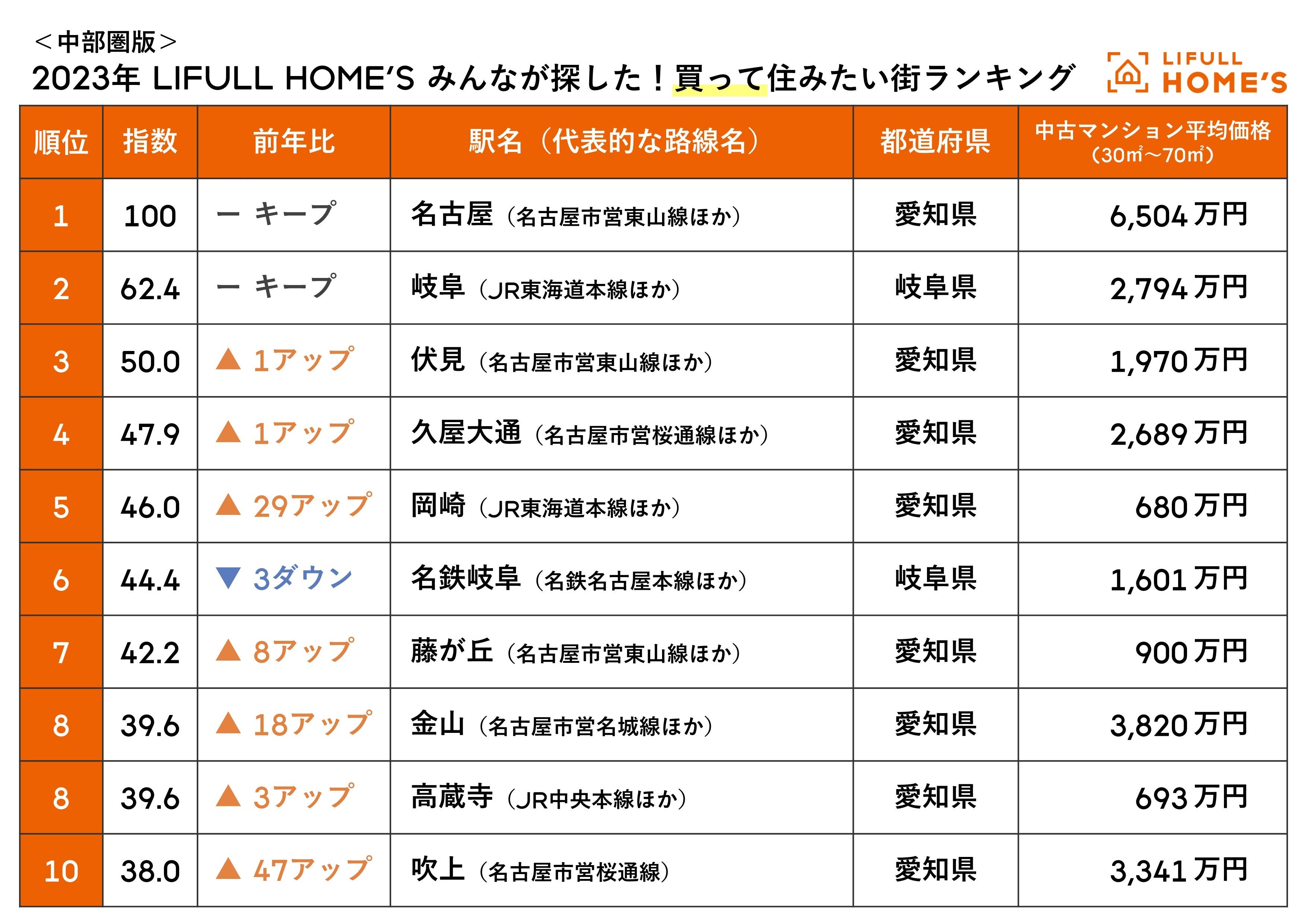 2位も2年連続で「岐阜」、3位には前回4位の「伏見」が入りました。前回3位の「名鉄岐阜」は6位に後退しましたが、「岐阜」とは徒歩5分程度しか離れておらず、事実上1つの街(駅)と考えても差し支えないため、購入希望者は岐阜中心部に注目していることがわかります。3位の「伏見」は「名古屋」周辺の駅であり、中部圏での“住みたい街覇権争い”はここ数年「名古屋」vs.「岐阜」の構図となっています。