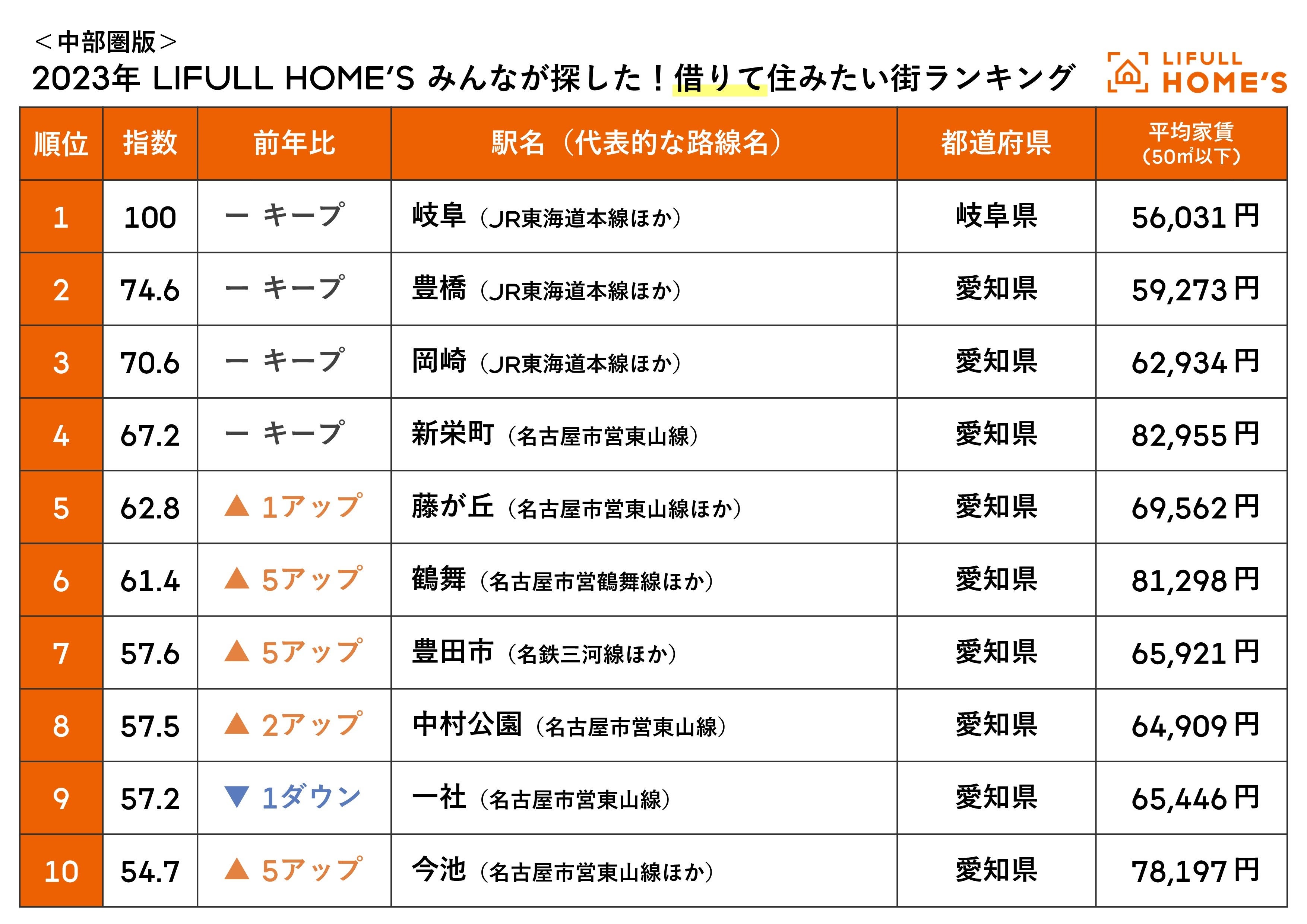 <中部圏版>2023年 LIFULL HOME'S みんなが探した!住みたい街ランキング