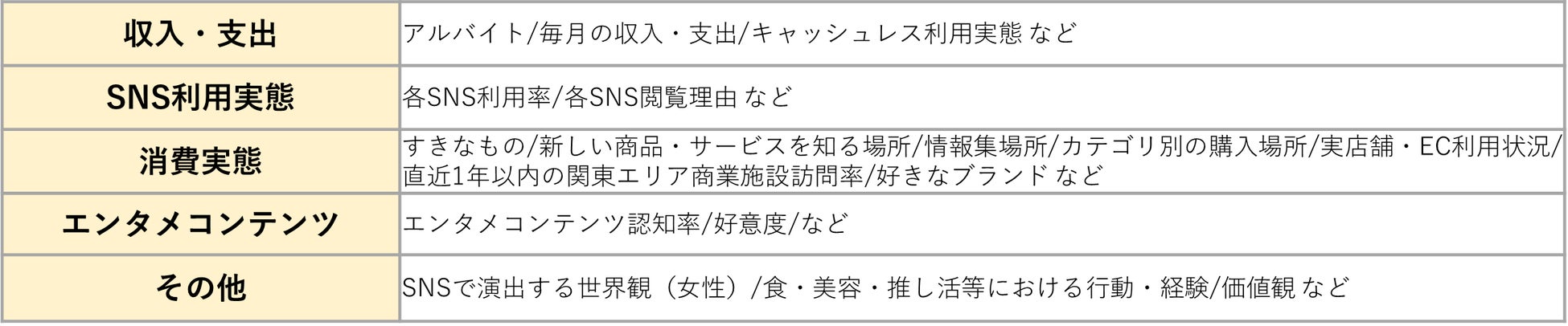 各SNSの利用率や消費実態・価値観等について、全26問の設問にて聴取しクロス集計にも対応しておりますので、Z世代の動向把握や企画立案に使う参考データとして活用いただけます。