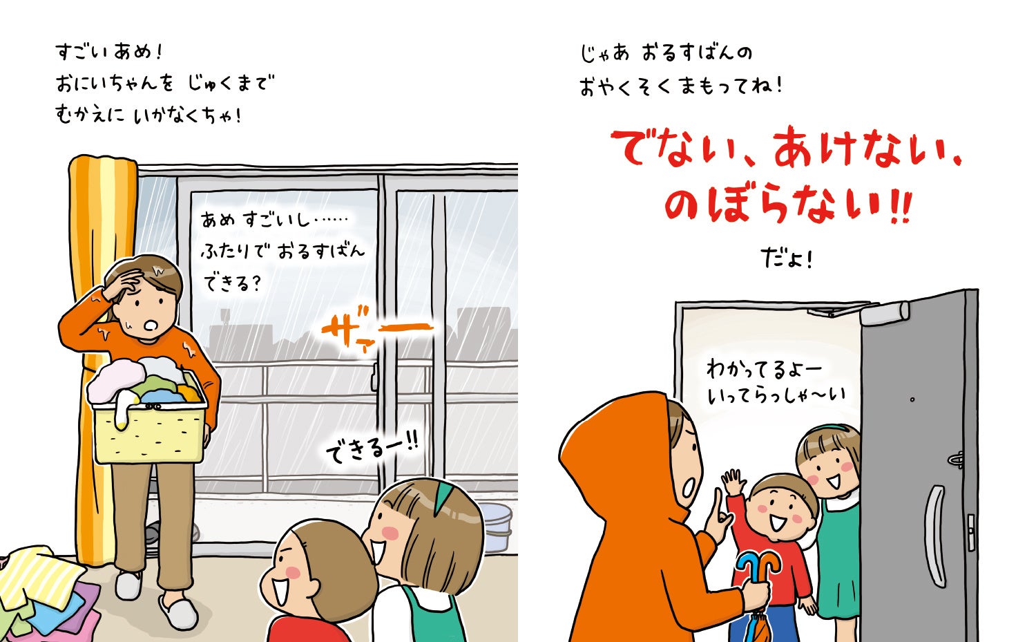 タイトルの「でない」は、家の外やベランダ、ピンポーンに出ない、「あけない」は玄関、風呂場、ベランダなどのドアを開けない、「のぼらない」は家具や浴槽などに登らない、という注意喚起です。